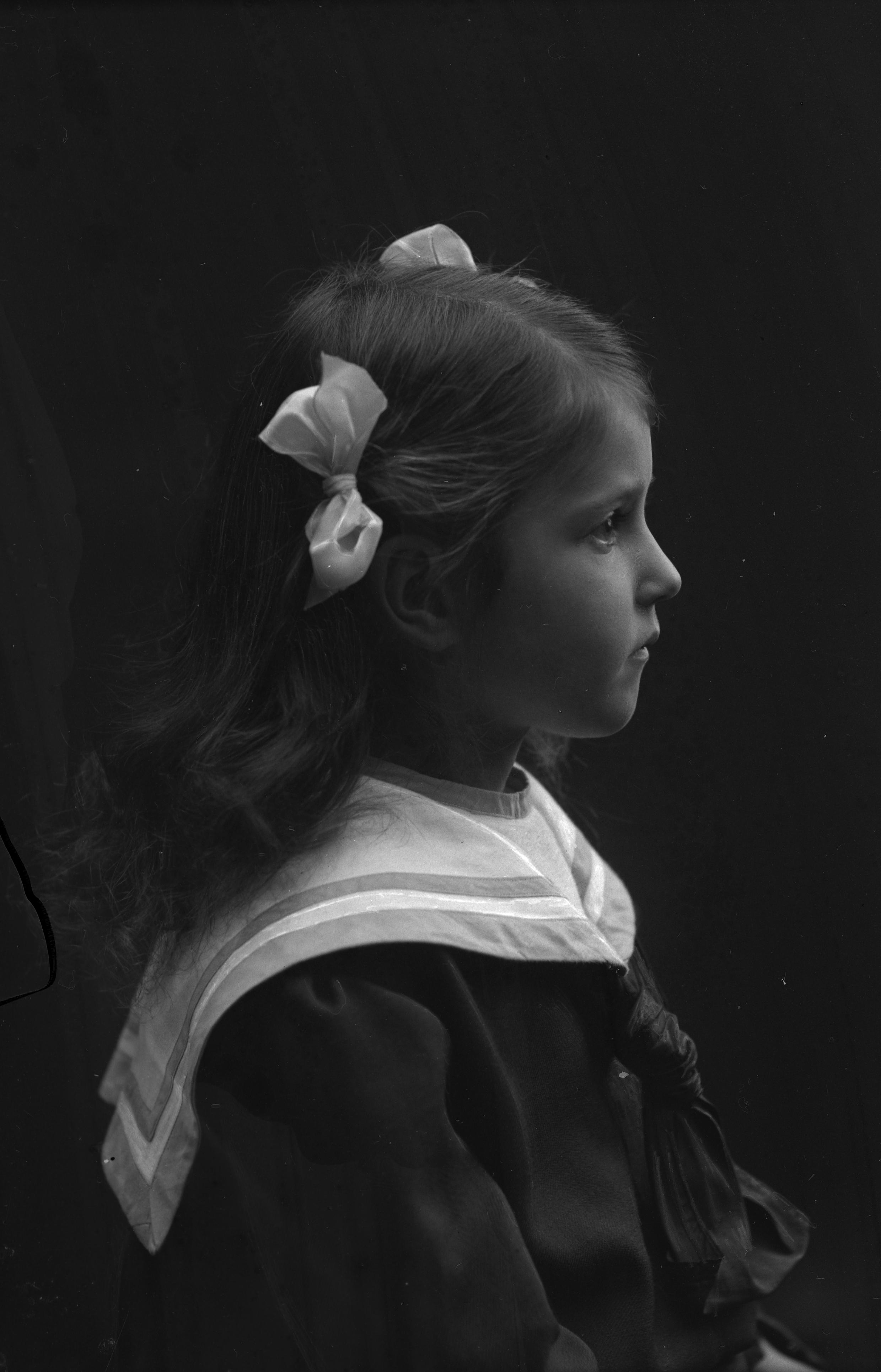 Porträtt i halvfigur, profil, av Nanna Skytte med rosetter i håret, iklädd sjömanskostym.
