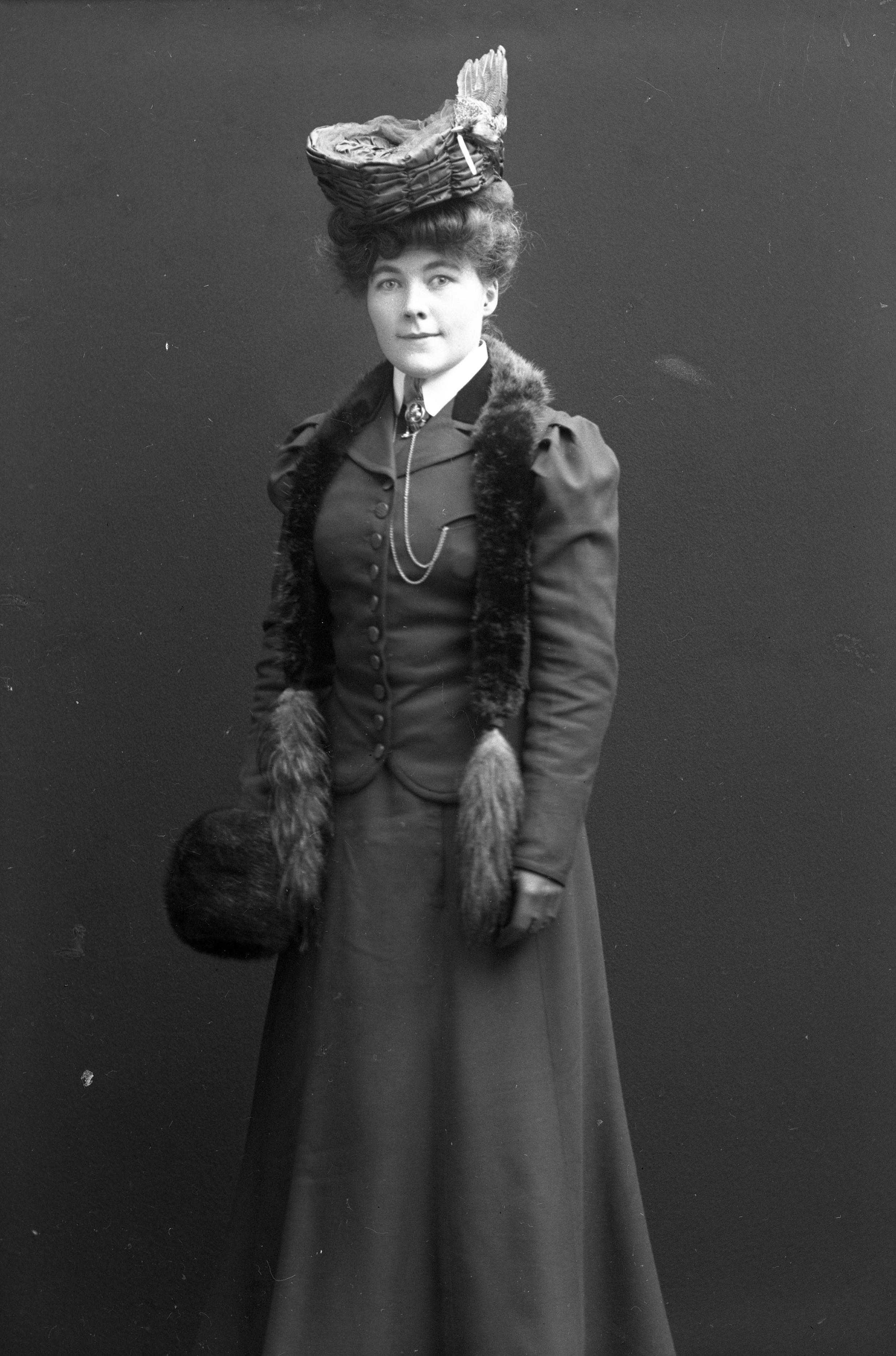 Porträtt i helfigur av Frida Persson, iklädd hatt och päls runt halsen, samt handmuff i päls.