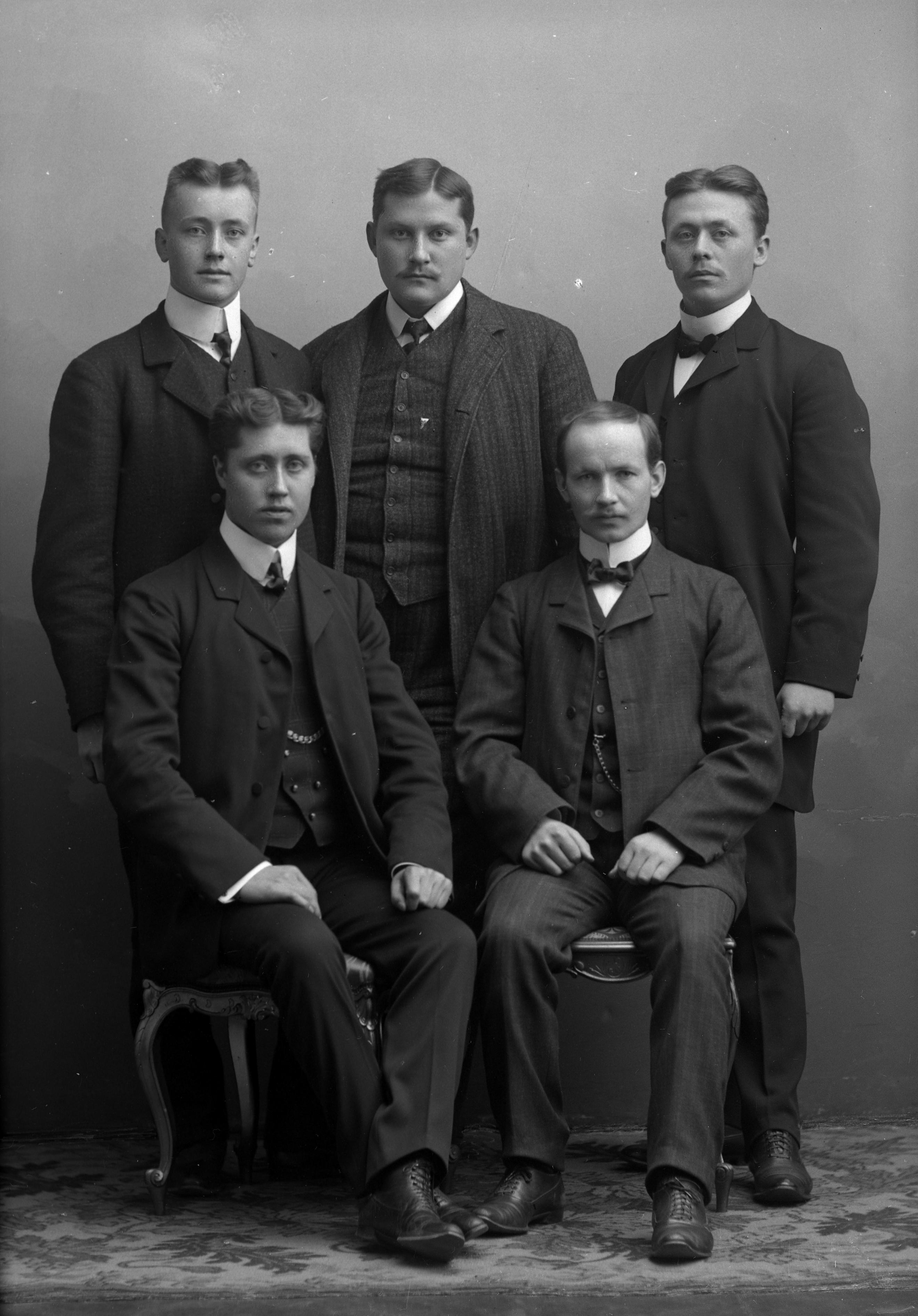 Porträtt i helfigur av C. A. Andersson, Rickard Andersson och Gustav Abrahamsson med okänt sällskap, två andra studenter, sittande och stående.