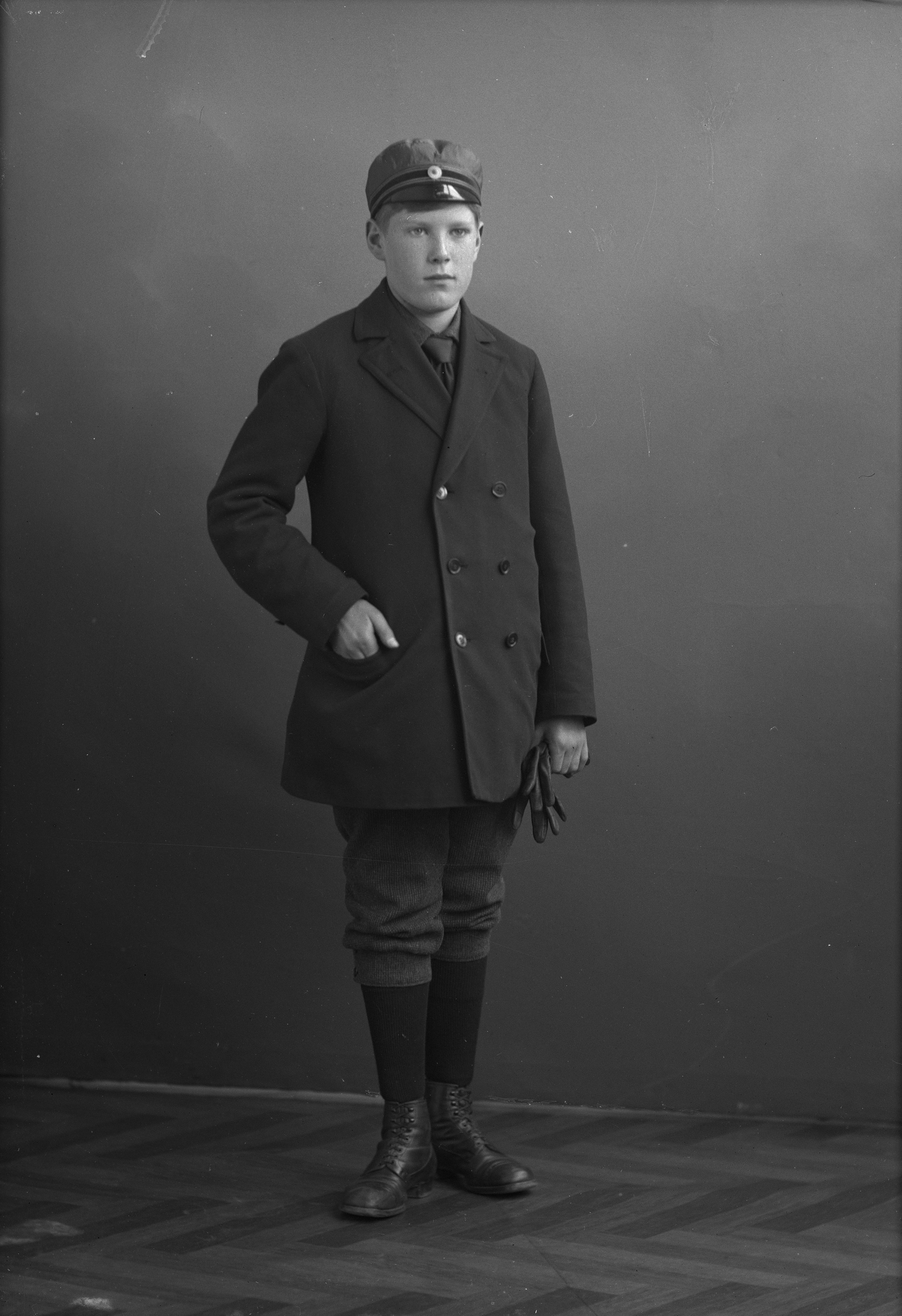 Porträtt i helfigur av Ebbe Svensson, iklädd realexamenmössa, hållande handskar.