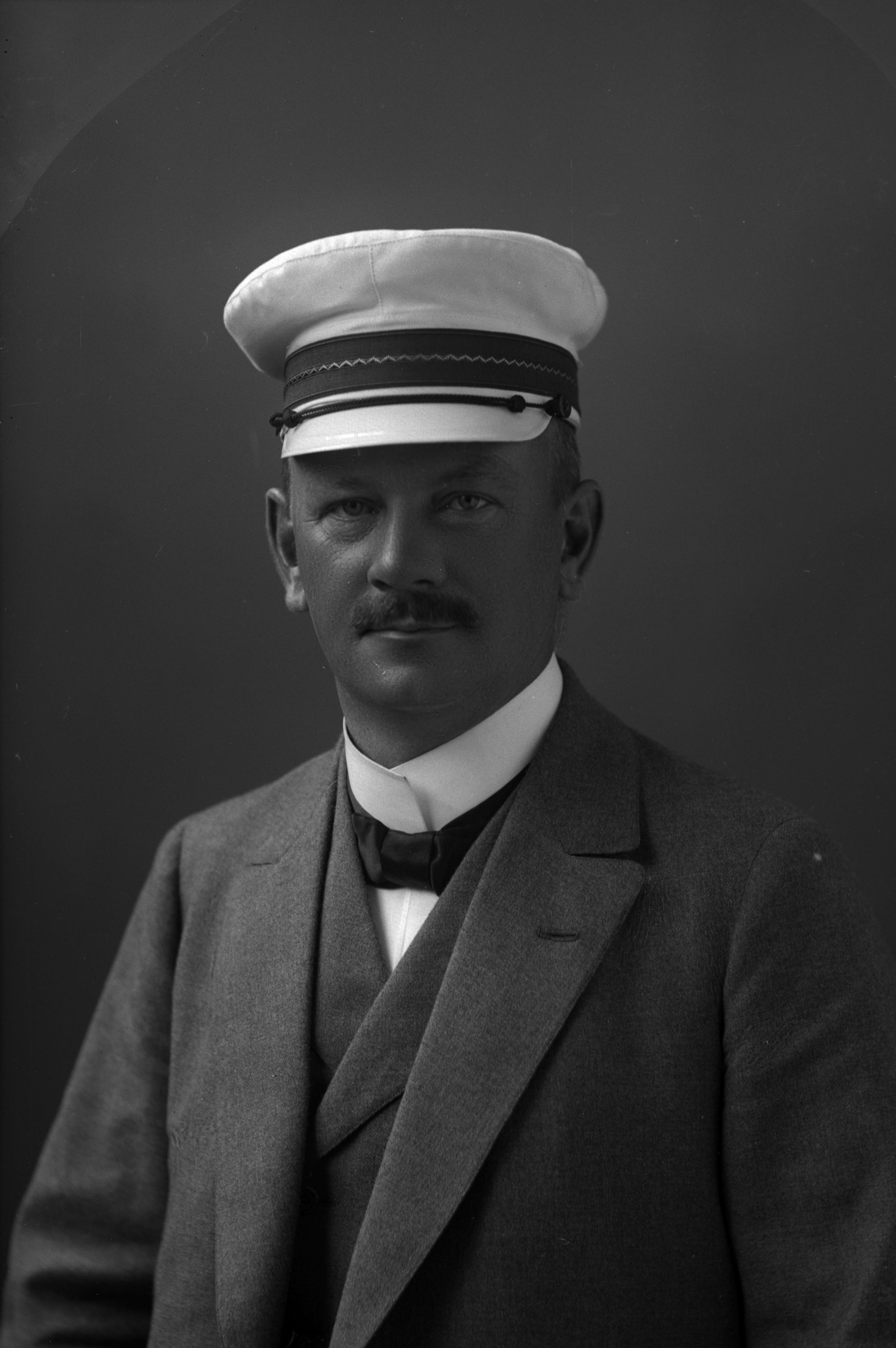 Porträtt i halvfigur av sågverksförvaltare Victor Berg, iklädd skärmmössa.