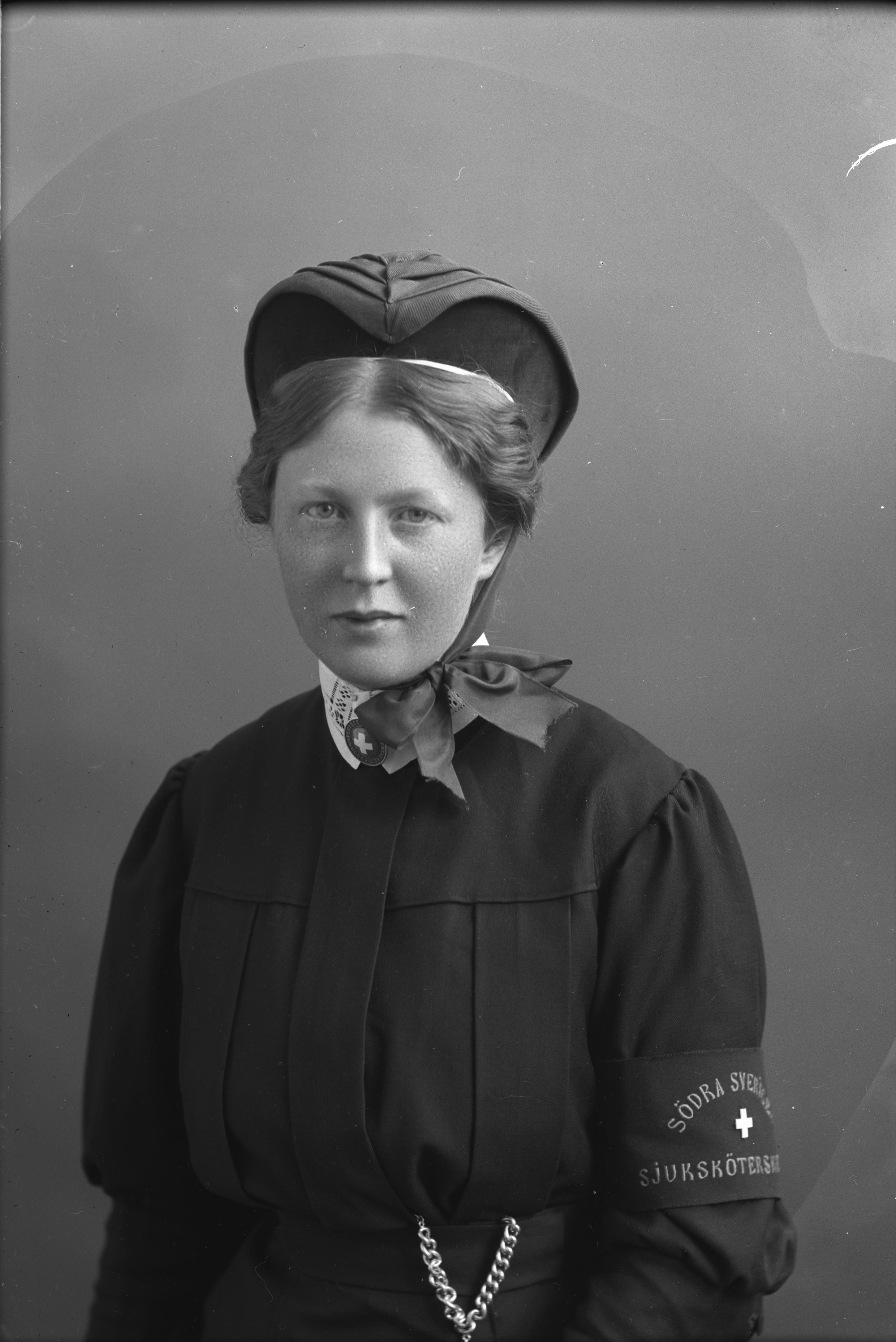 Porträtt i halvfigur av Ester Pettersson i sjuksköterskeuniform, bärande armbindel med texen "Södra Sveriges Sjuksköterskehem".
