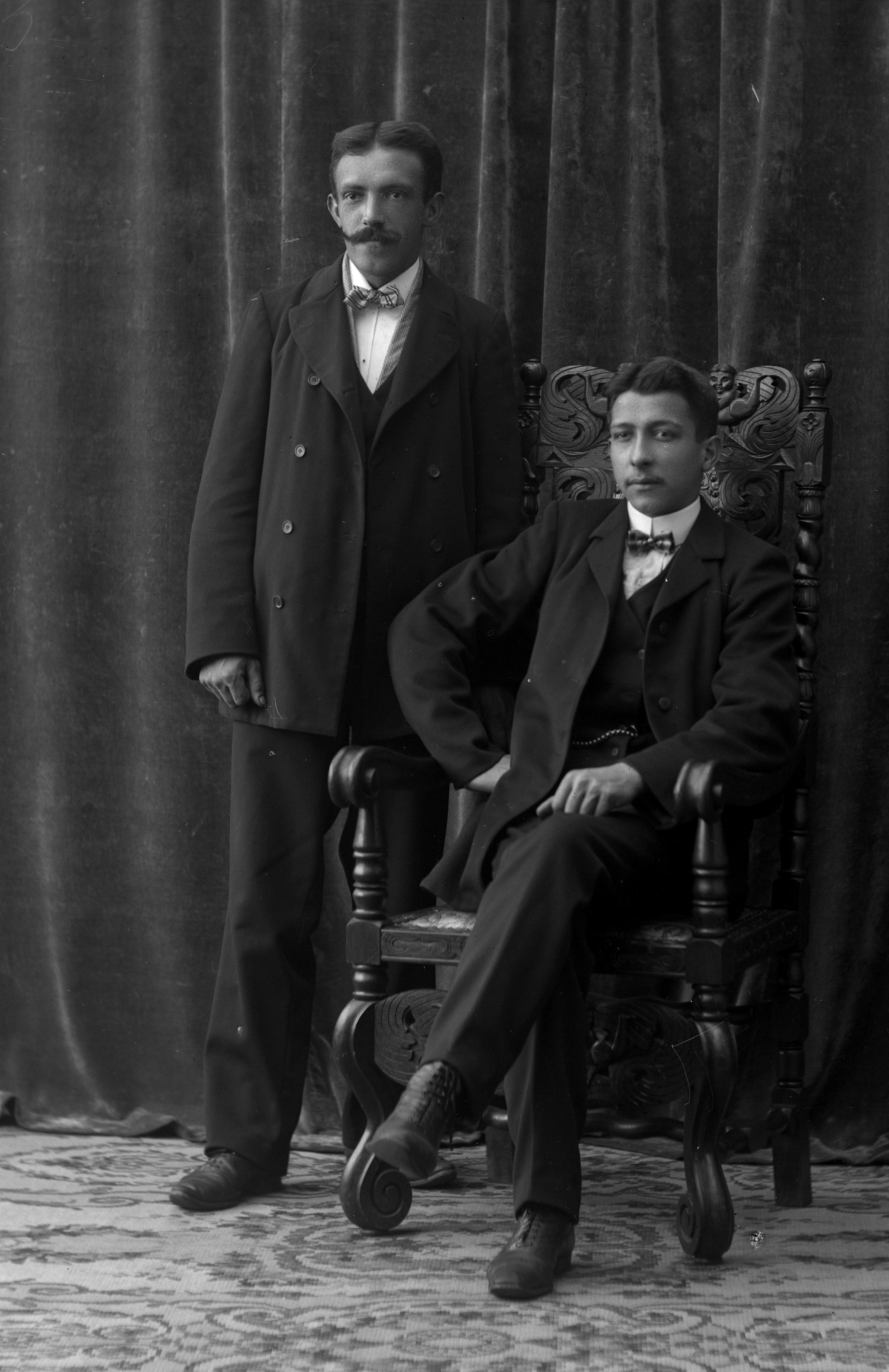 Porträtt i helfigur av styrman herr Eriksson med okänd man. En av männen sittande i karmstol.