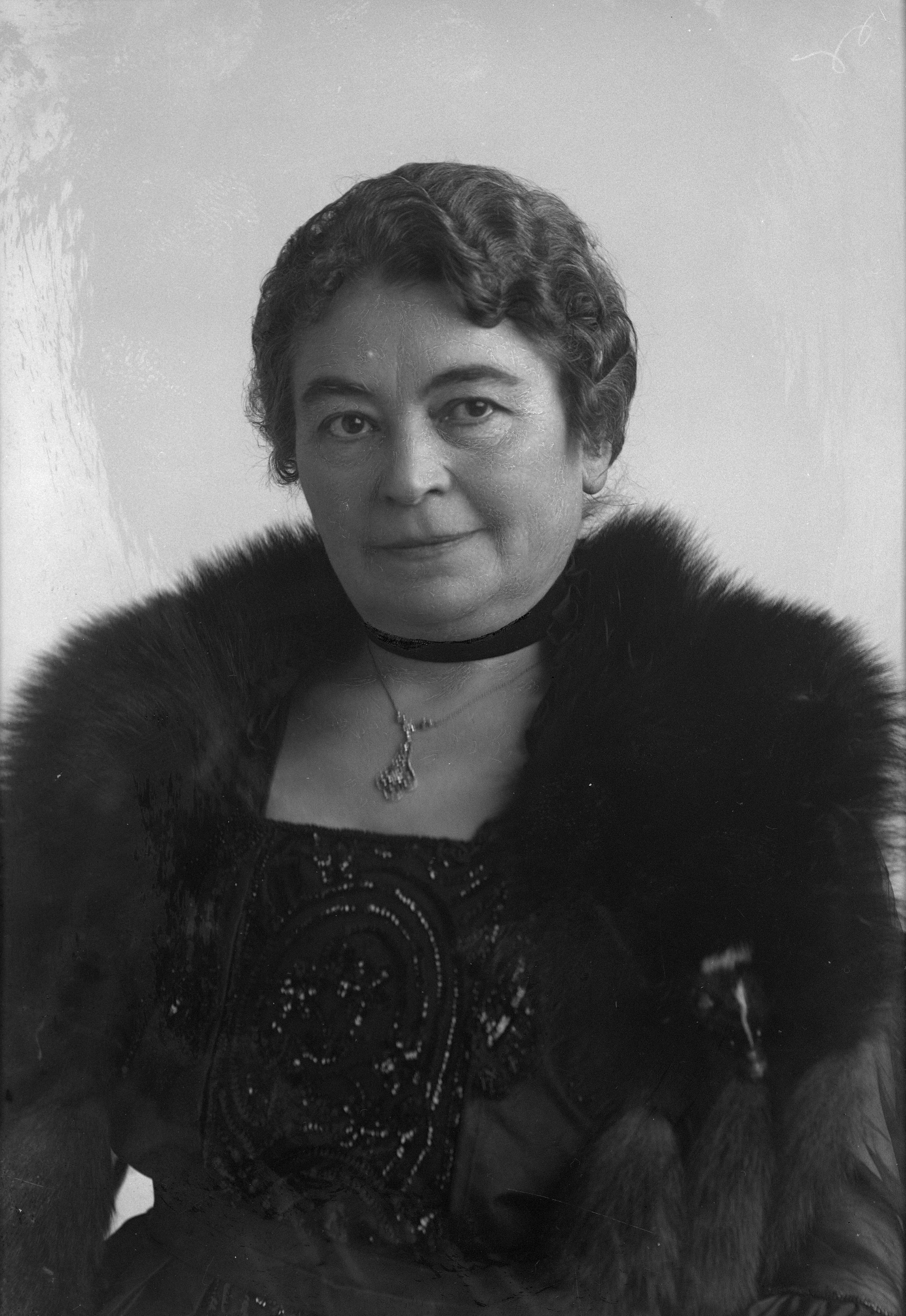 Porträtt i halvfigur av fru Öhrström med stor päls runt halsen.