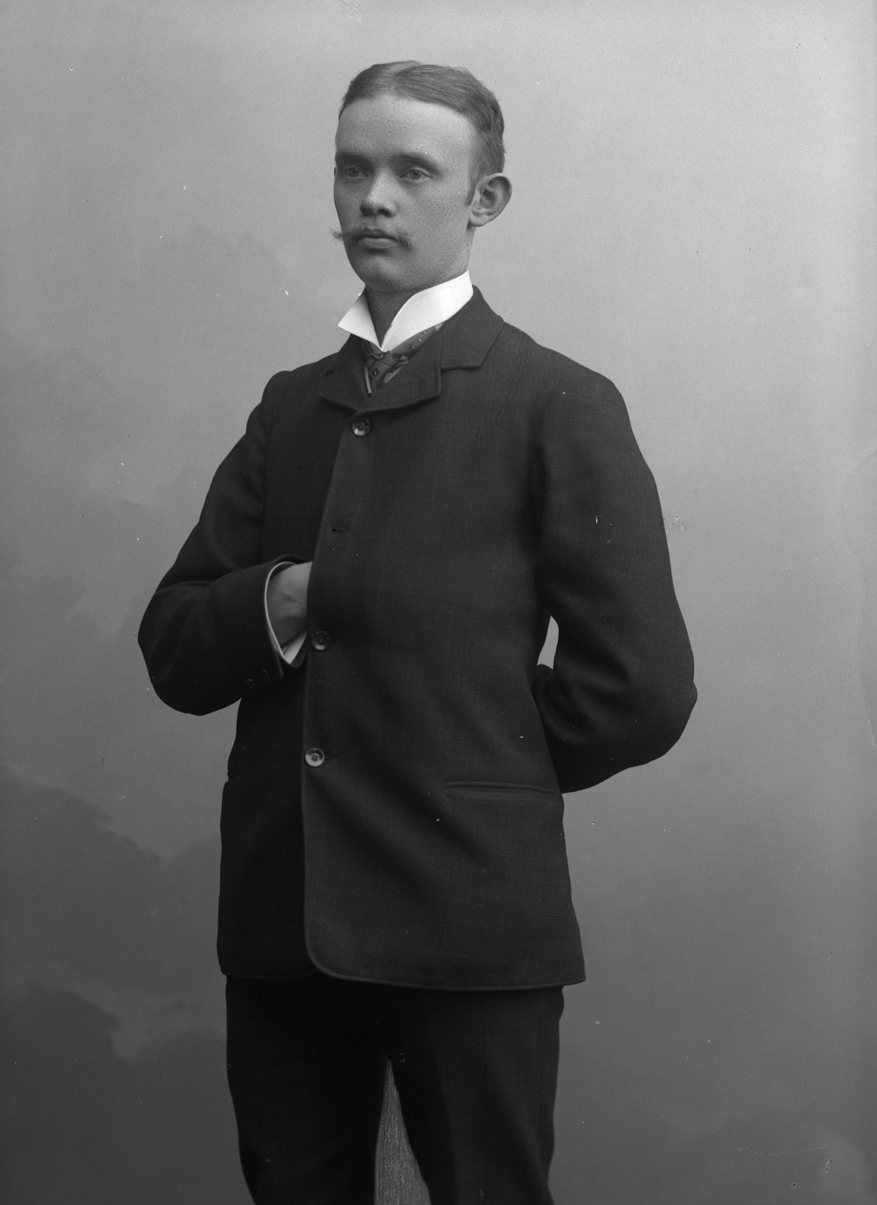 Porträtt i helfigur av handelsbokhållare Arvid Bengtsson Berger.