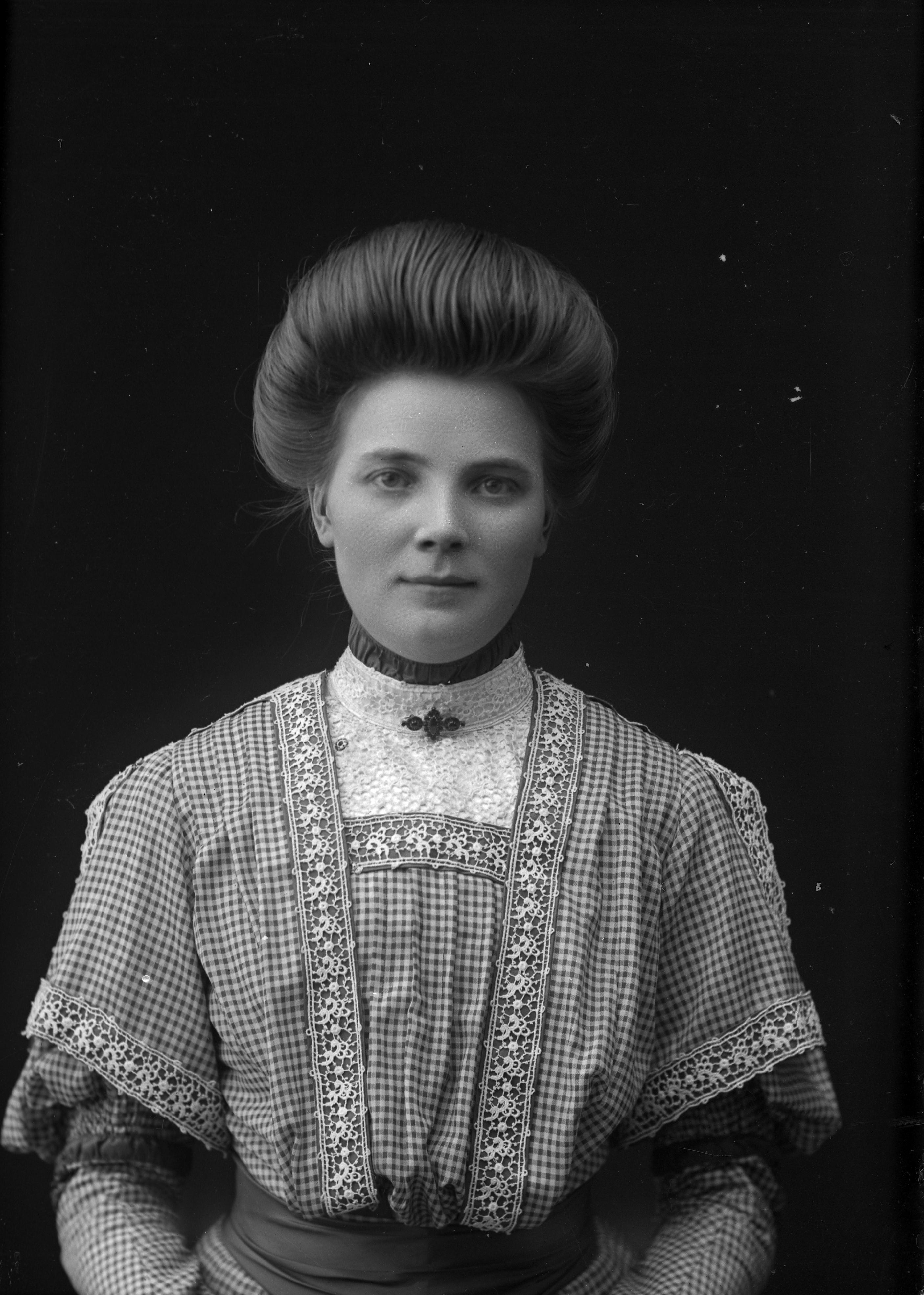 Porträtt i halvfigur av Anny Malmström, anställd vid järnvägsrestaurang.
