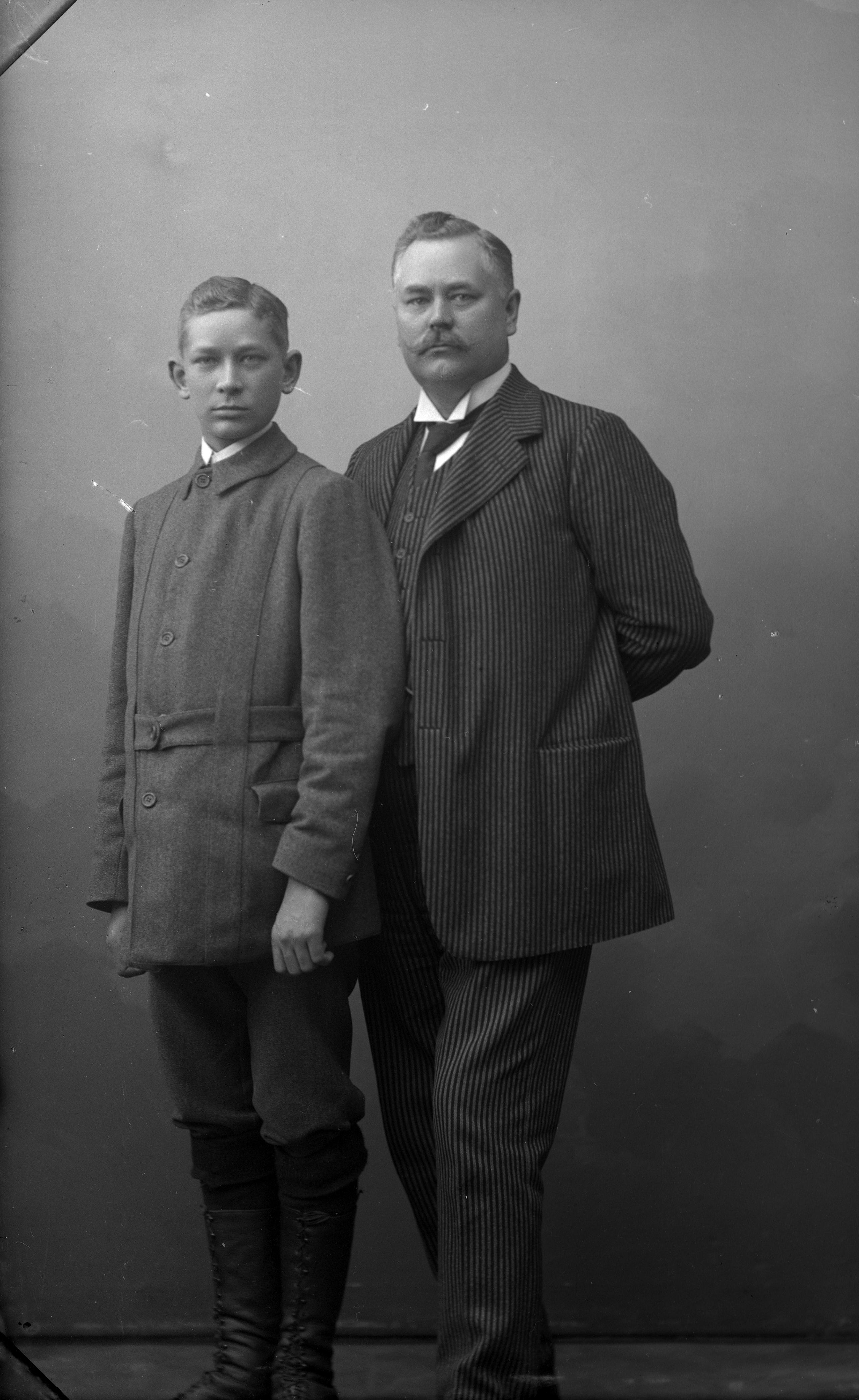 Porträtt i helfigur av juveleraren, direktör Carl Holm vid G. Dahlgren & Co., med sonen Gunnar.