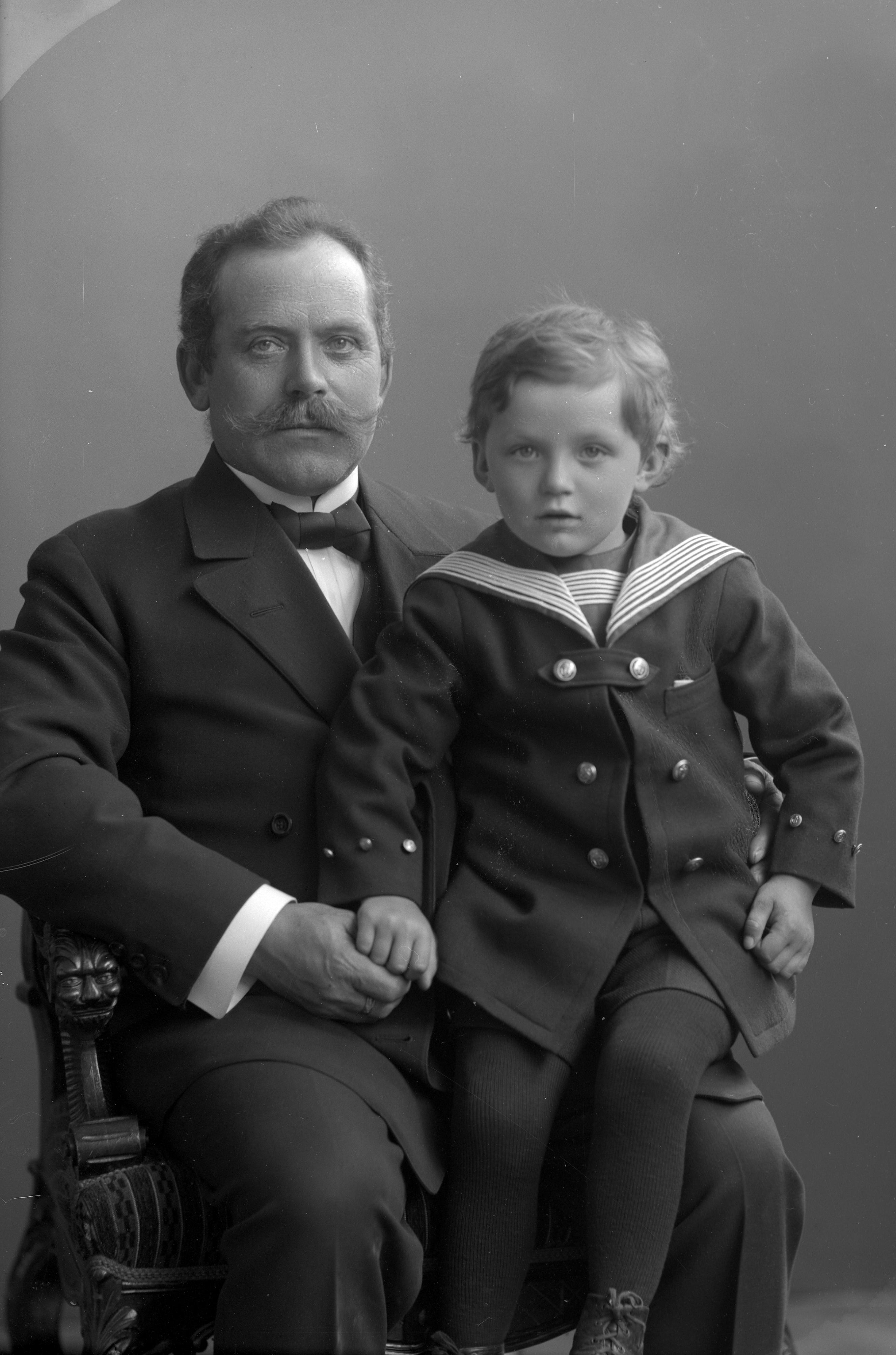 Porträtt i helfigur av byggnadssnickare Alfred Hellberg med sonen Frithiof. Fadern sittande i stol, med sonen sittande i knät. Sonen iklädd sjömanskotym.