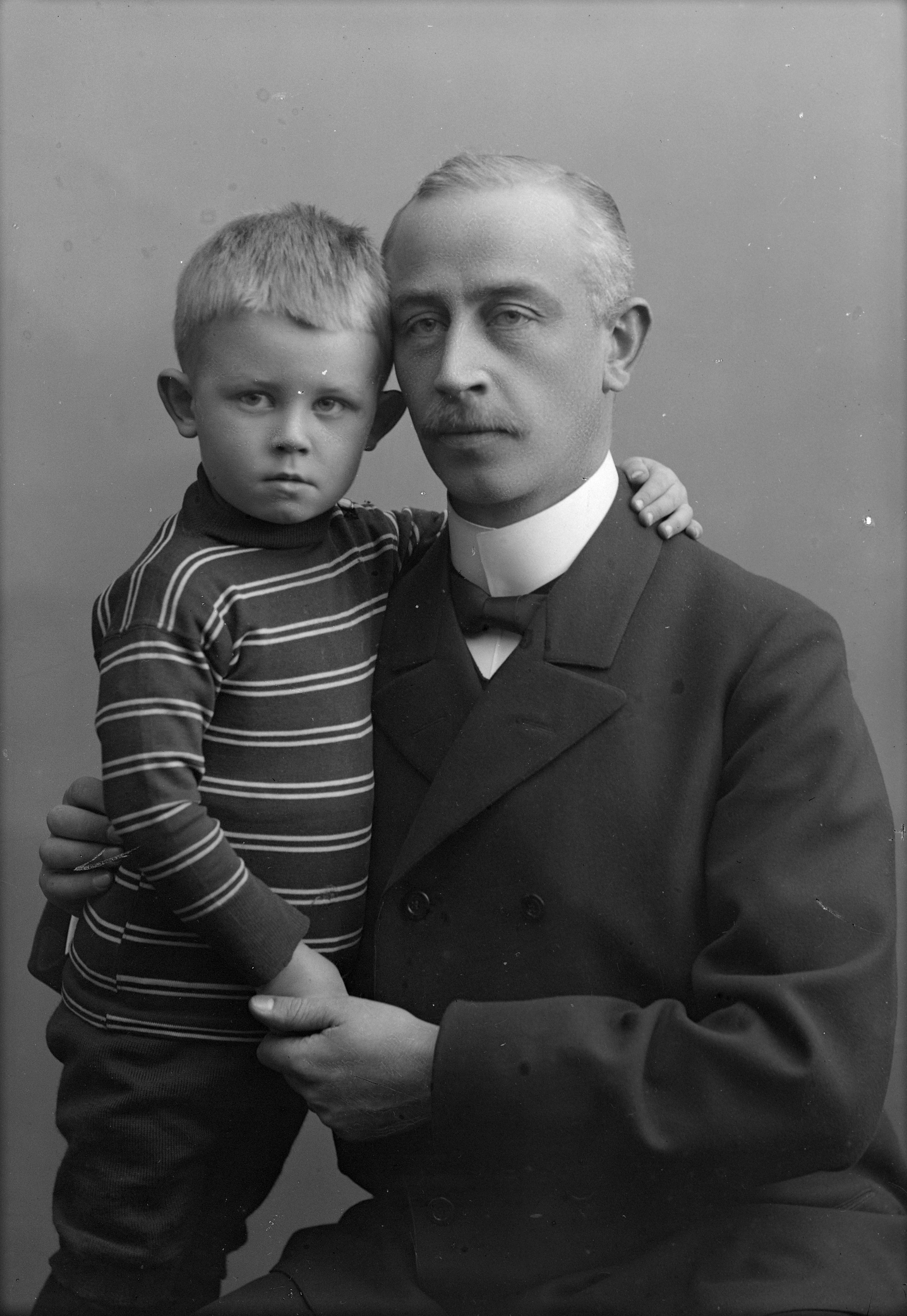 Porträtt i helfigur av varvsingenjör Axel Andersson med sonen Gösta.