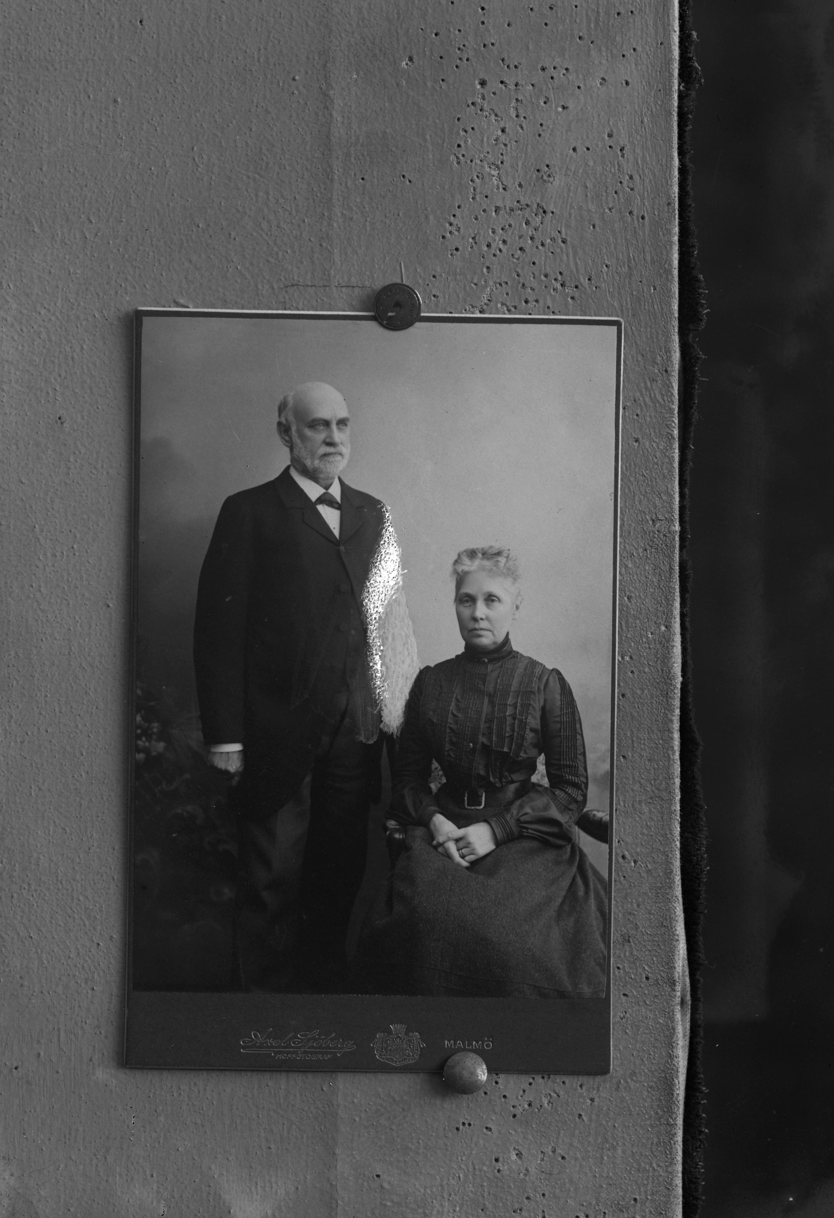 Porträtt i helfigur av grosshandlare Johan Aspegren med frun Emmy. Frun sittande. Visitkort med ateljélogotyp, "Axel Sjöberg /Hoffotograf /Malmö". Visitkort besällt av Emmy Aspegren.