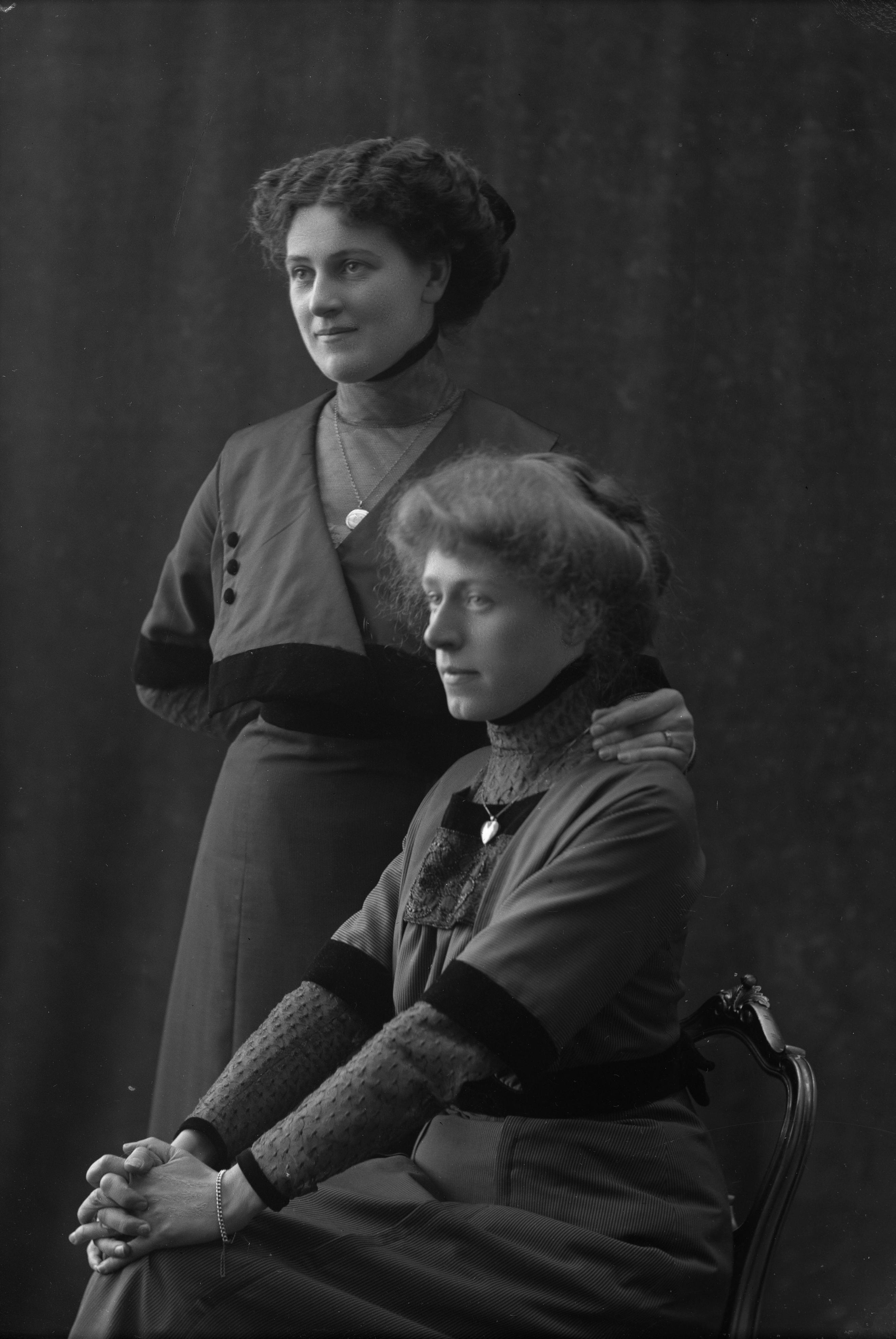 Porträtt i helfigur av fröken Nilsson med Ester Sebenius, stående.