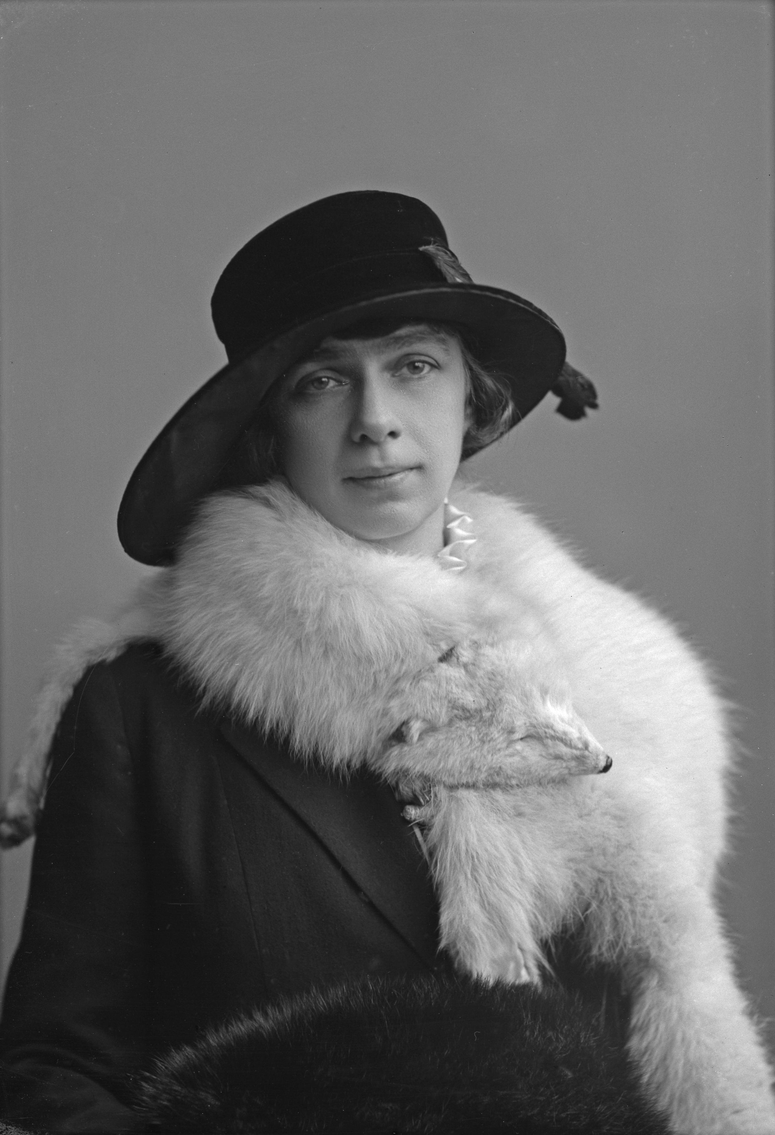 Porträtt i halvfigur av fru Ulfves, iklädd stor hatt, ytterkappa och rävpäls.