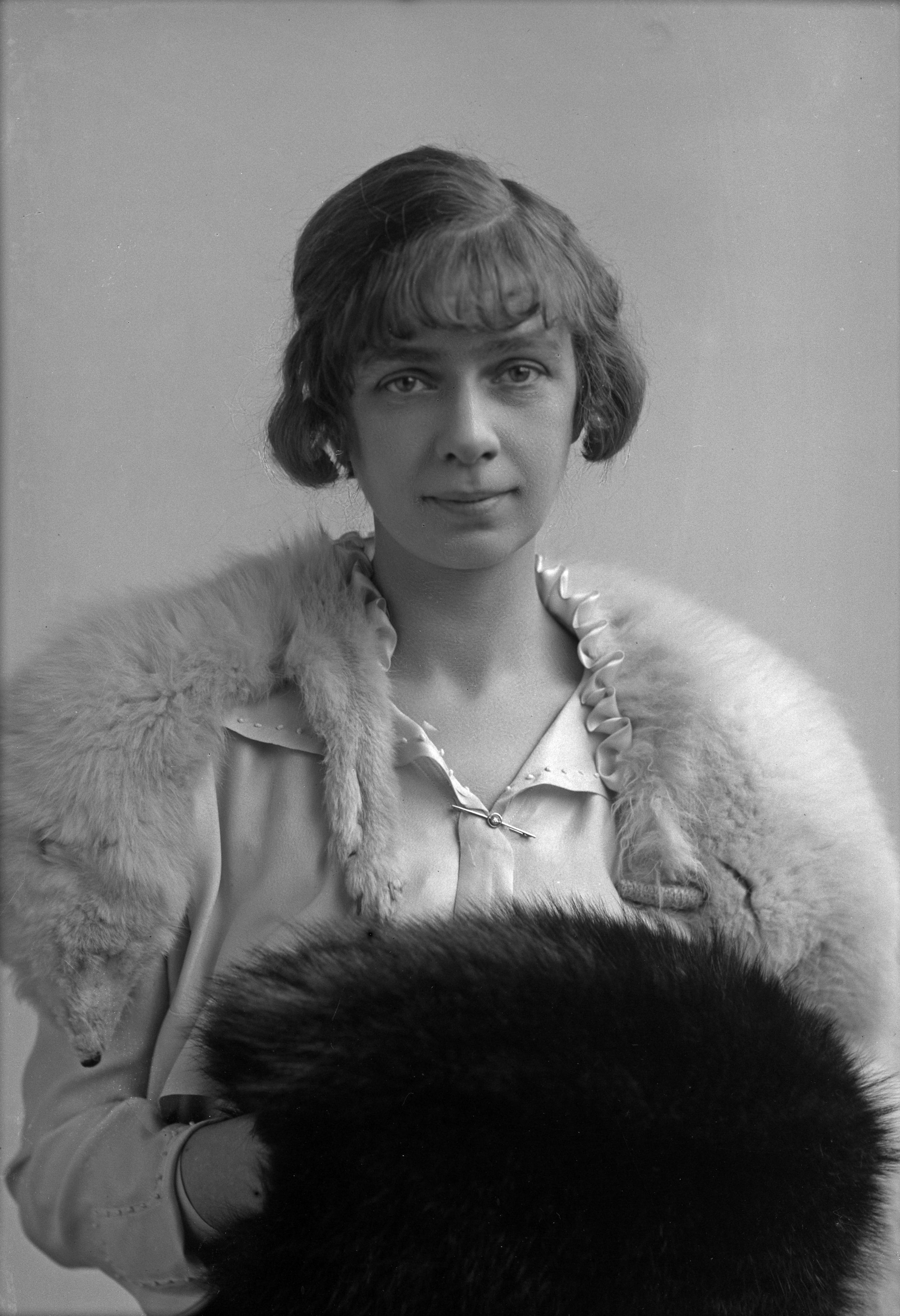 Porträtt i halvfigur av fru Ulfves med rävpäls runt halsen.