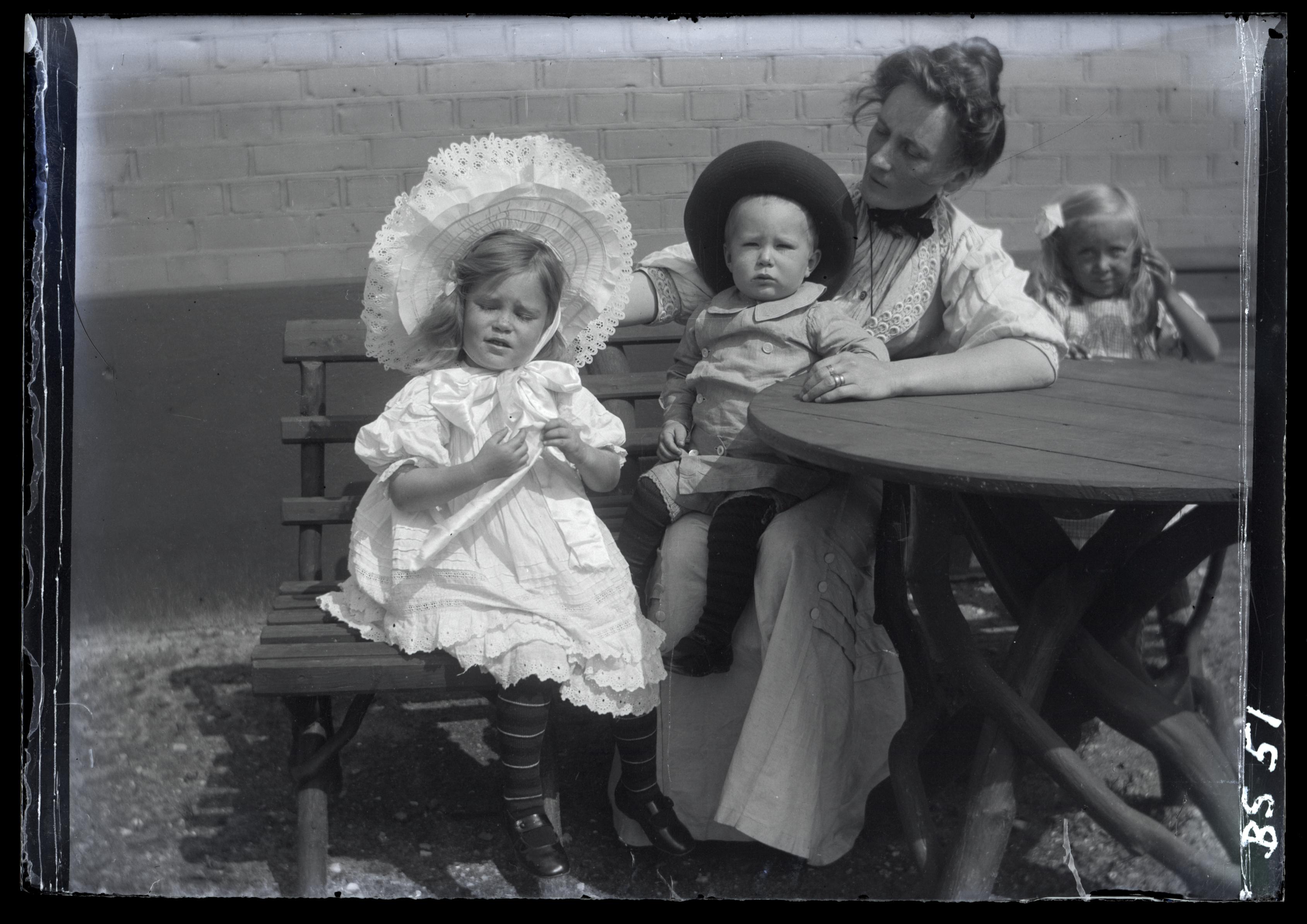 Fotografi av två oidentifierade barn och en kvinna, sittande vid ett trädgårdsmöblemang. Gunhild Sjöberg längst till höger. Flickan till vänster med stor hätta, pojken i hatt.