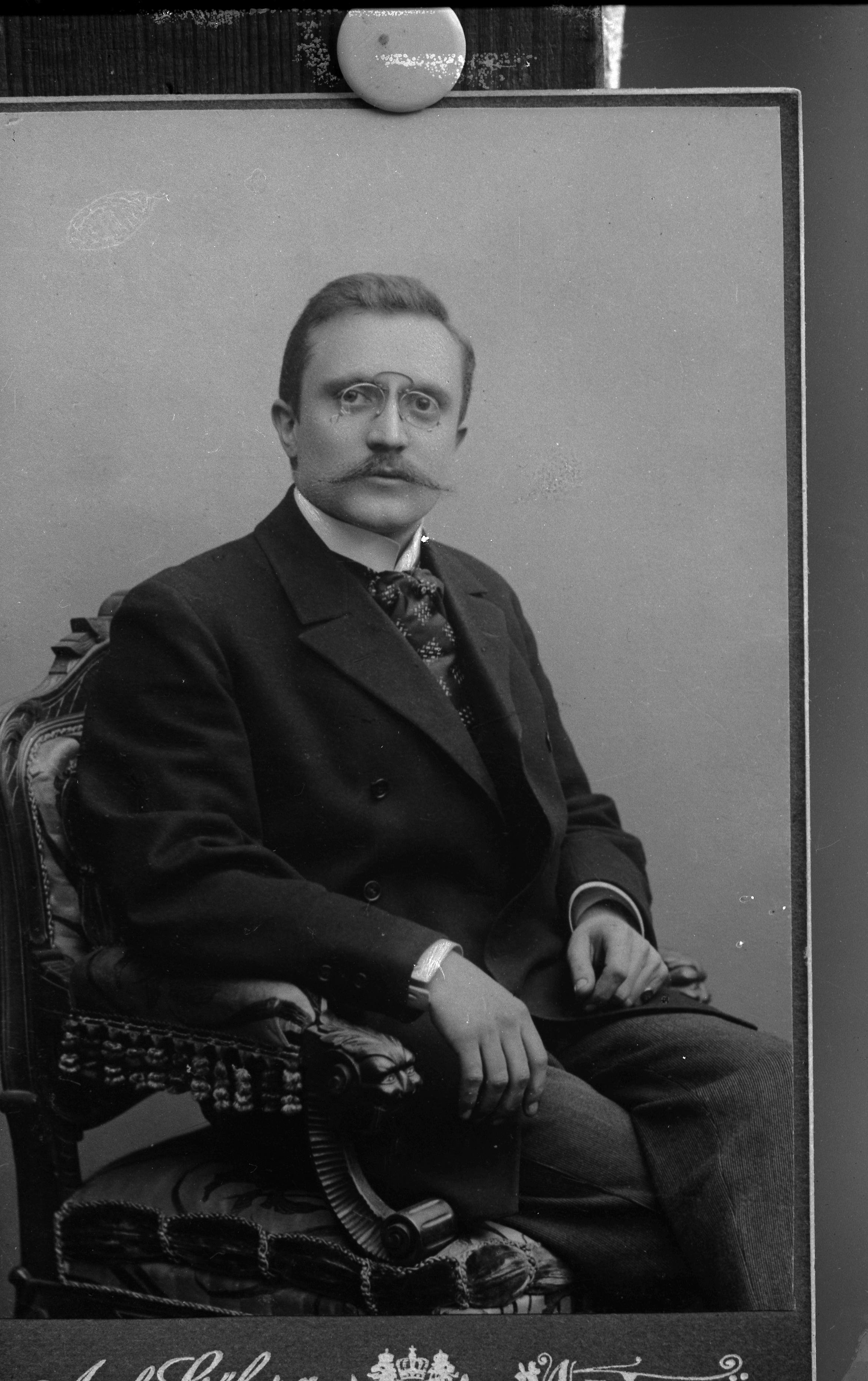 Porträtt i helfigur av fabrikör Christian von Brenekow. Visitkort med ateljélogotyp, endast delvis synlig.