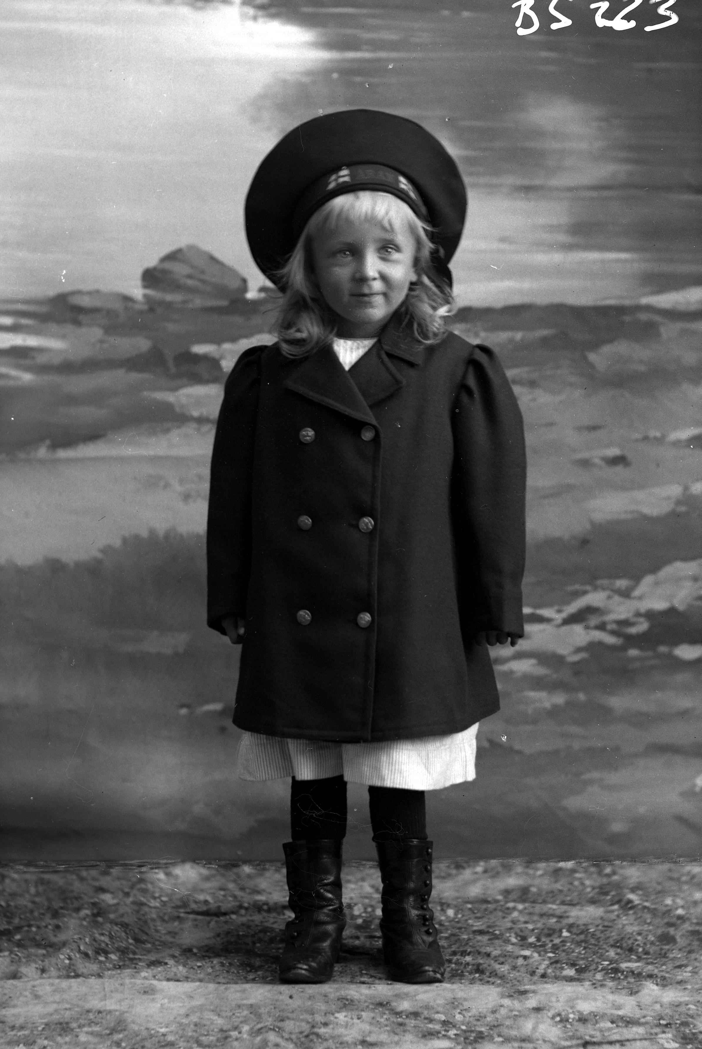 Porträtt i helfigur av Gunhild Sjöberg, iklädd ytterkappa och mössa. Fotograferd framför ateljéfond med strand- och sjömotiv.