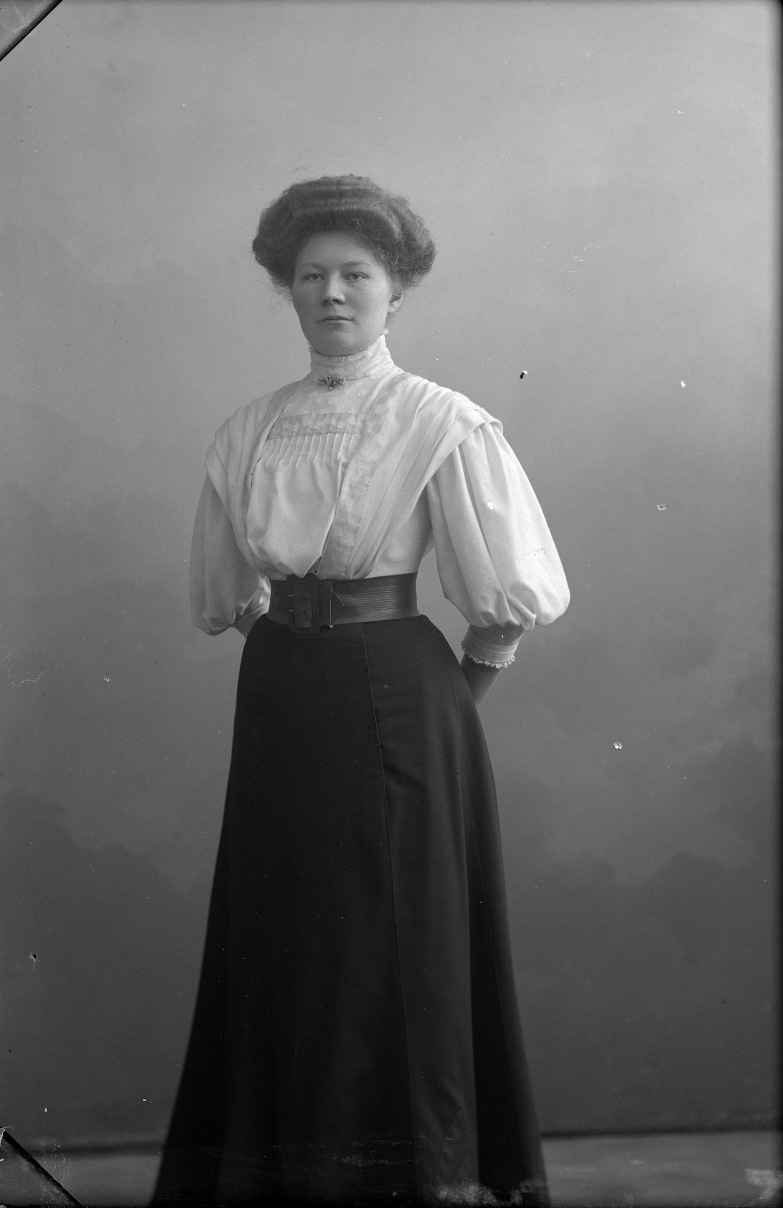 Porträtt i helfigur av skrädderskan Olinda Nilsson.