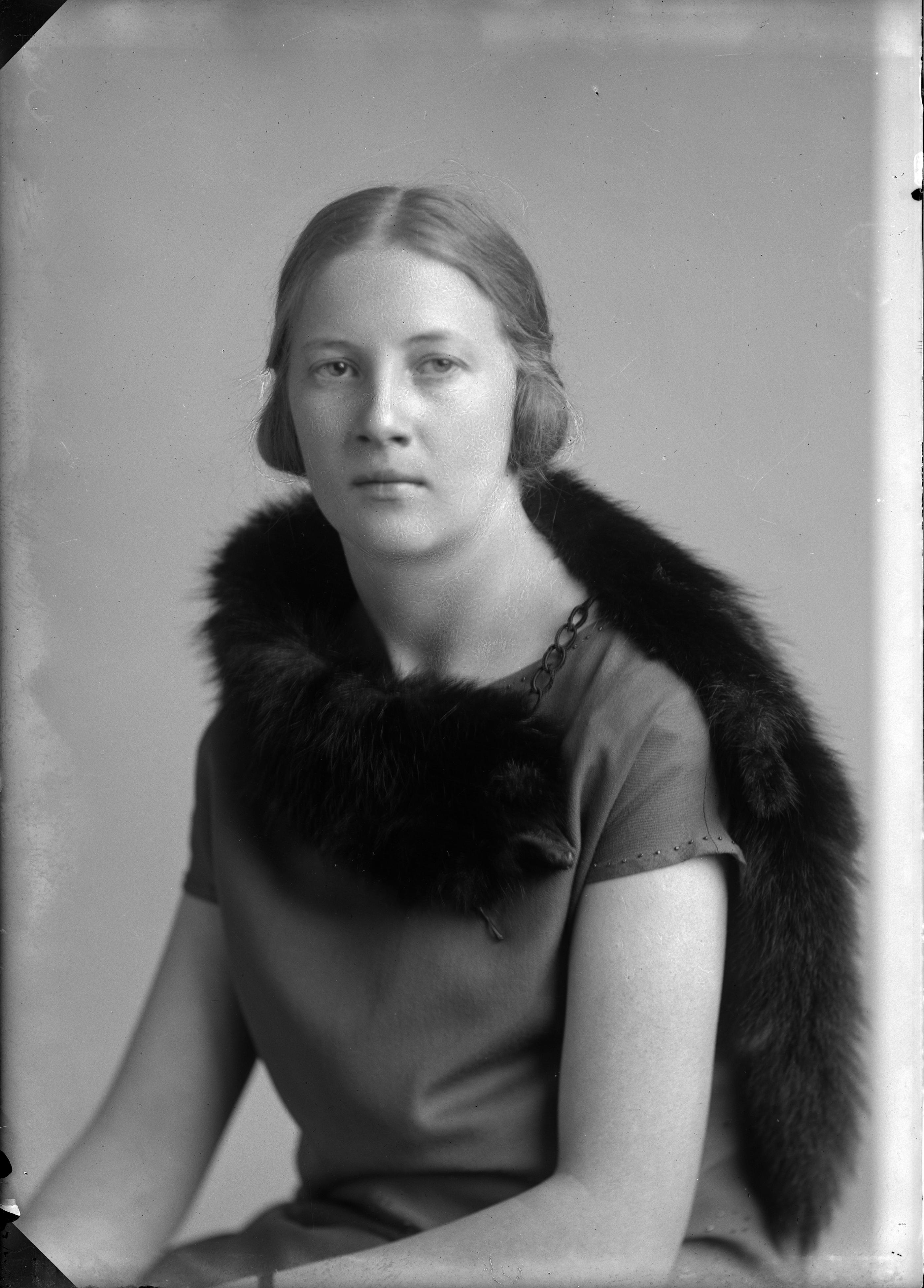 Porträtt i halvfigur av Thora Linde med rävpäls runt halsen.