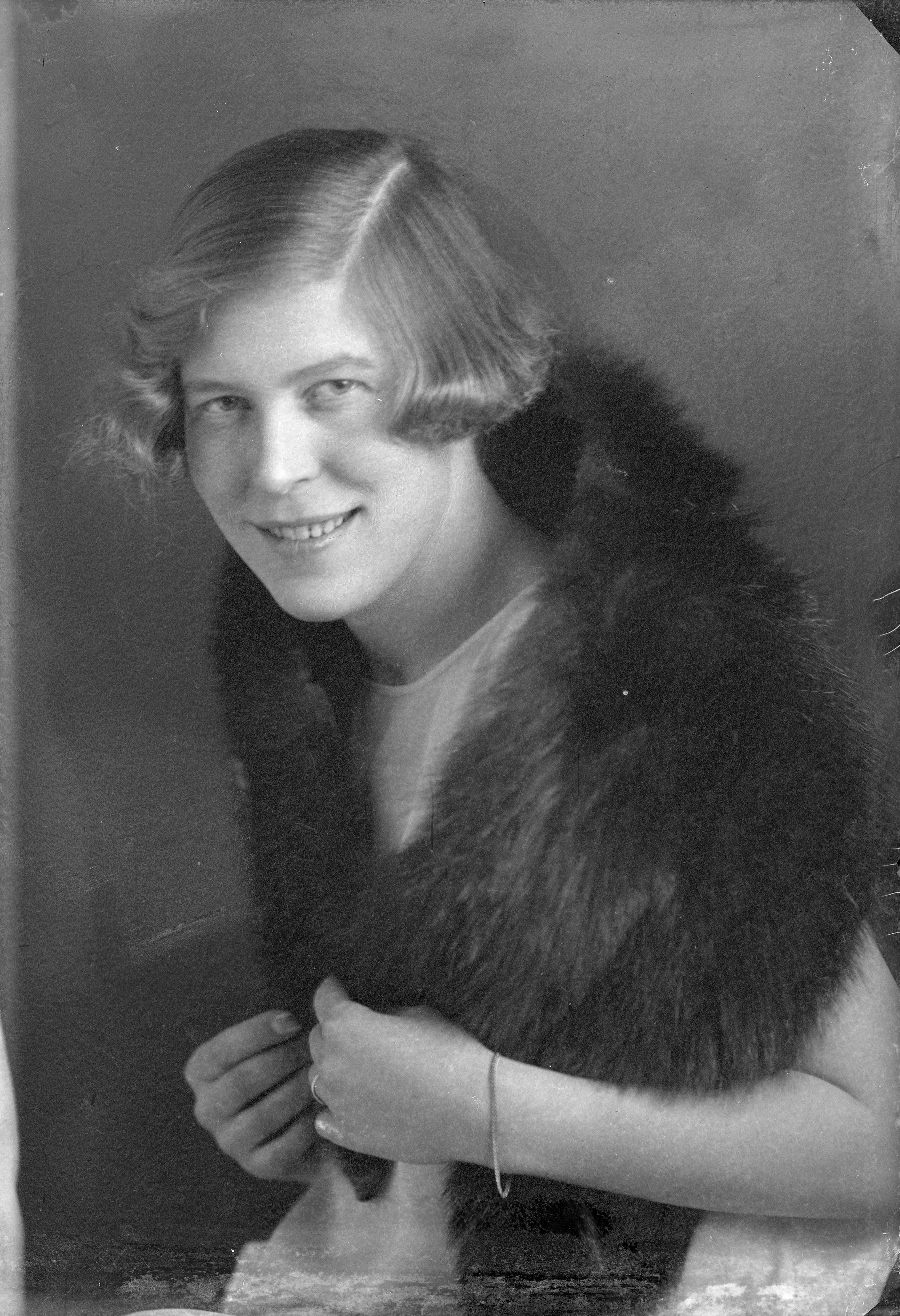 Porträtt i halvfigur av Dagmar Sjöblom, sjukgymnast, med rävpäls runt halsen.