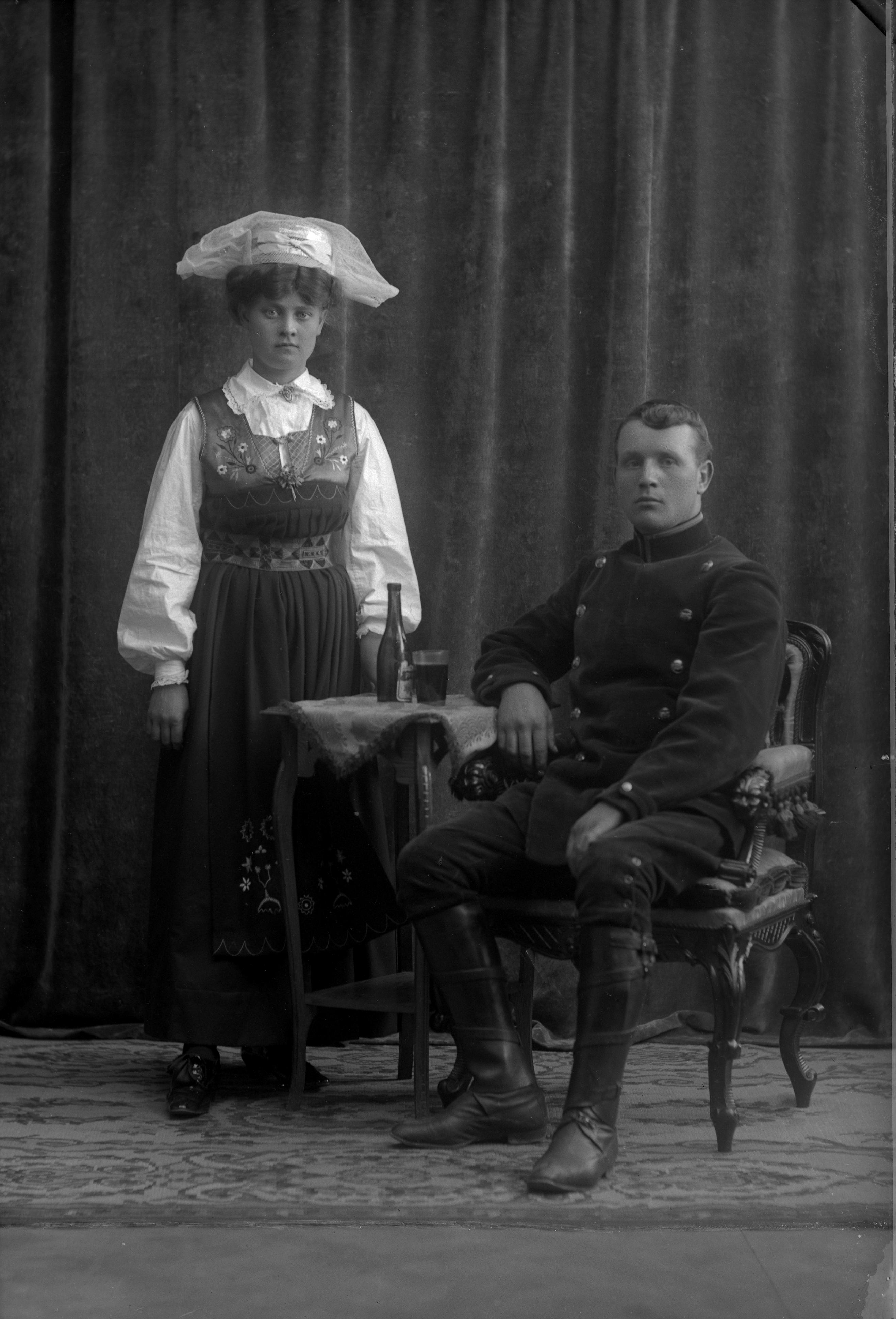 militäruniform, folkdräkt, Vingåkersdräkt, stol, bord, glas, flaska, draperi