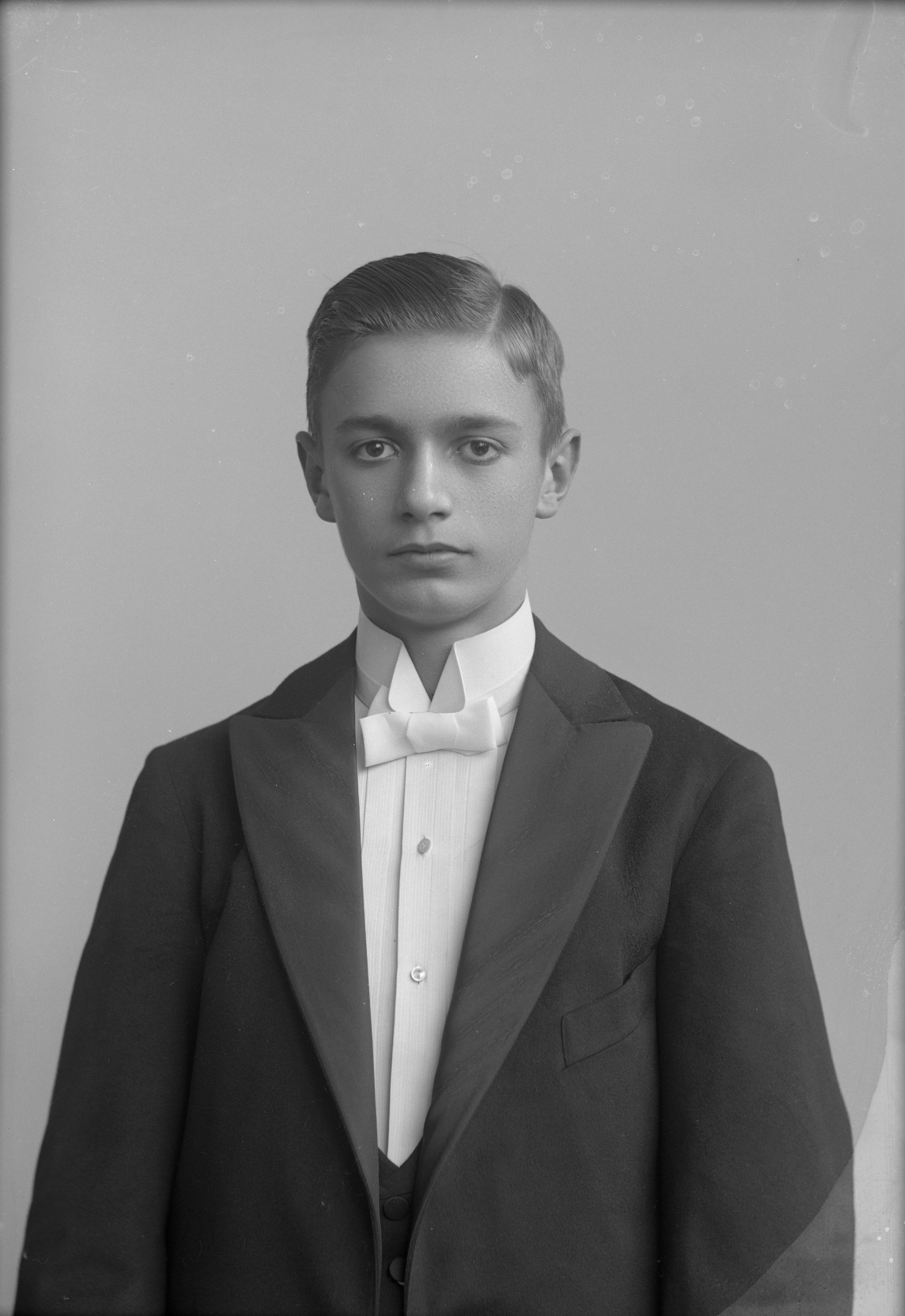 Porträtt i halvfigur av konfirmanden Johannes Strand.
