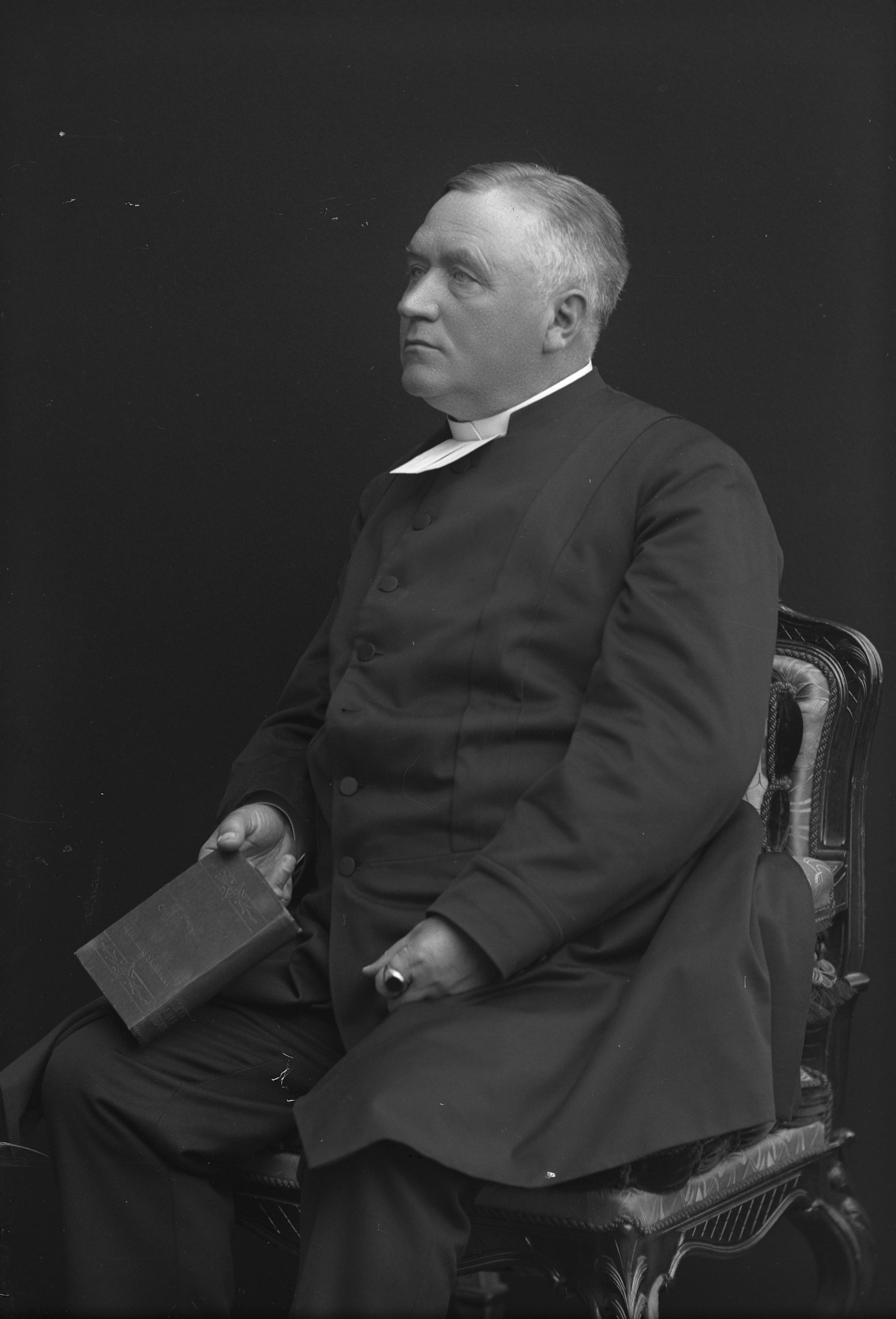 Porträtt i helfigur av kyrkoherde Carl Olaus Dahlin, iklädd yrkesklädsel med prästkrage, sittande i stol med bibel i handen.