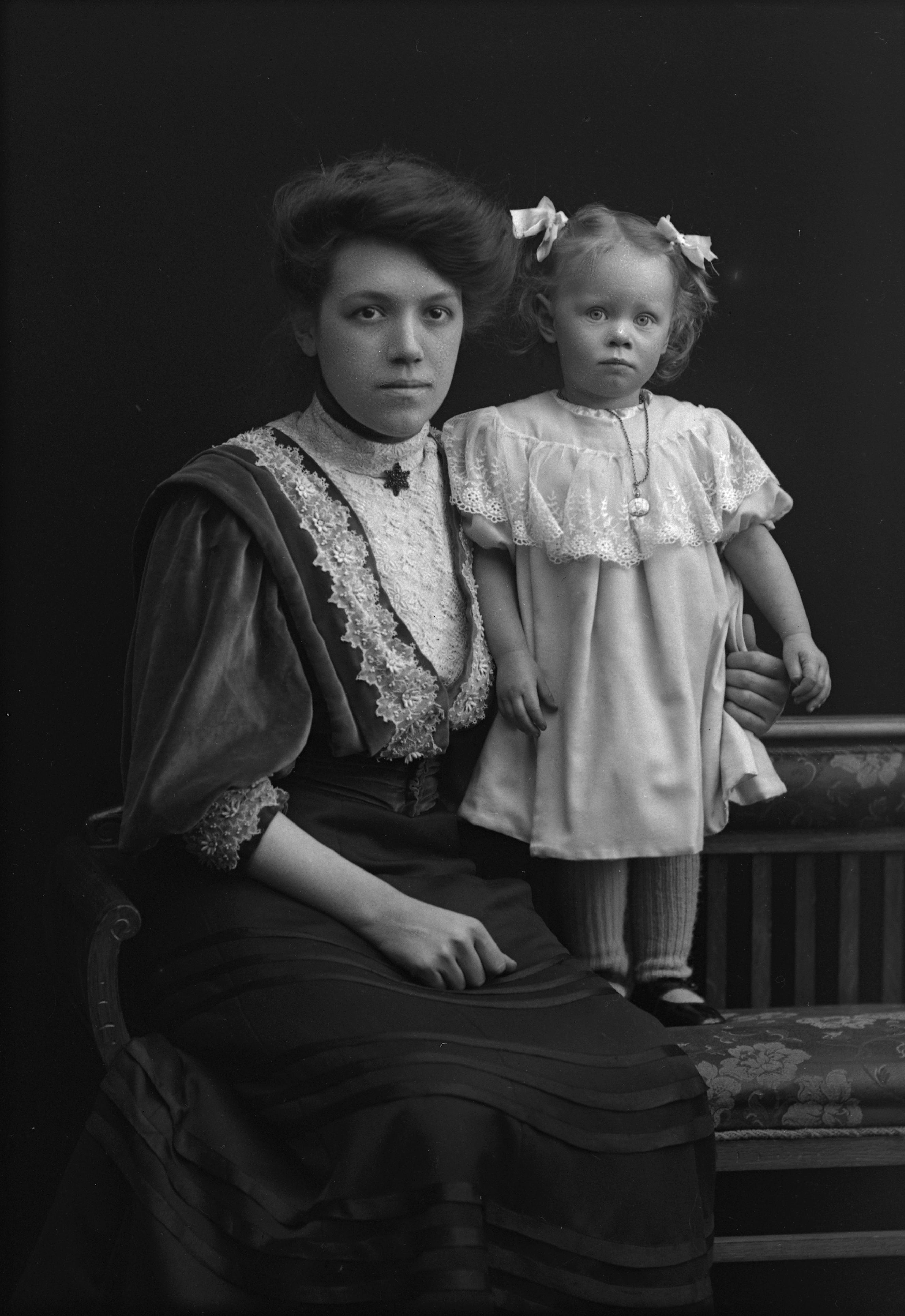 Porträtt i helfigur av telefonisten Svea Gillberg med okänd flicka. Hon sittande på bänk, flickan stående på bänken bredvid henne. Flickan med rosetter i håret.