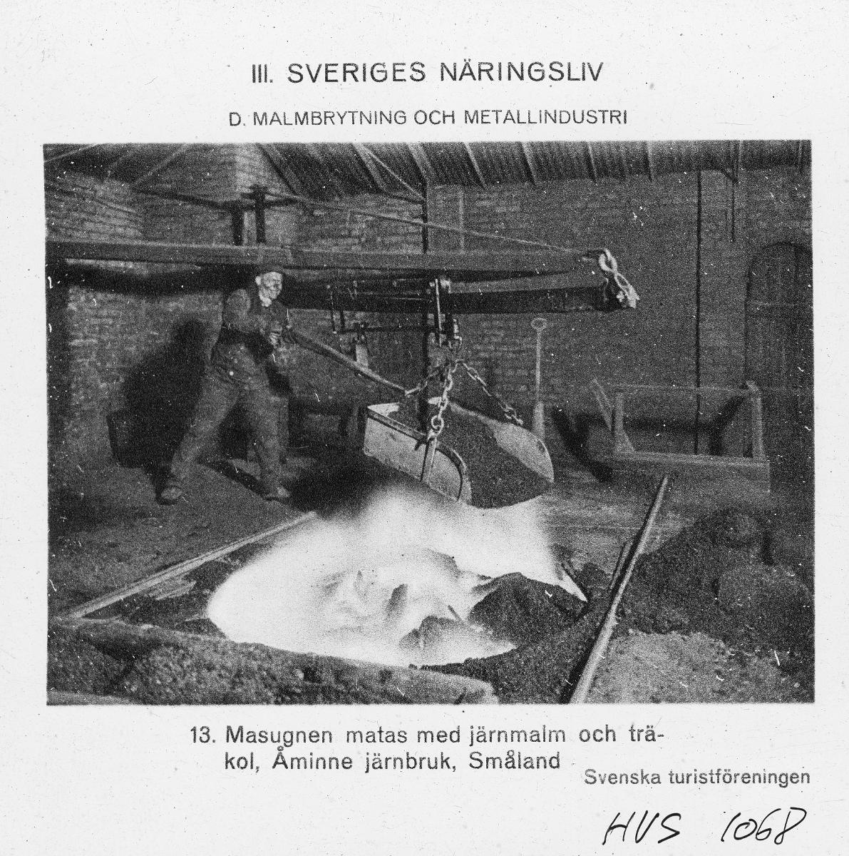 Masugnen matas med järnmalm och träkol. Åminne järnbruk, Småland