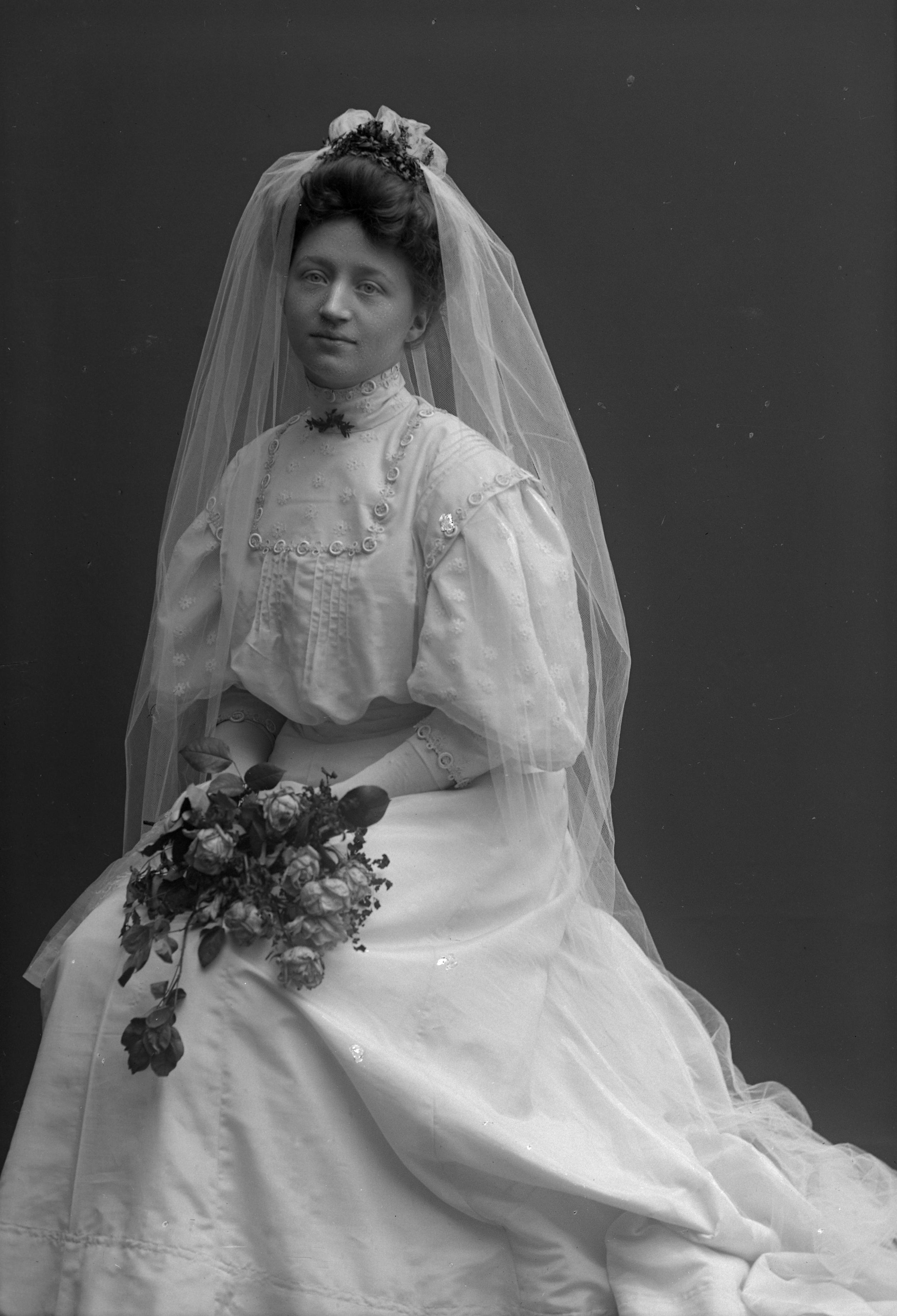 Porträtt i helfigur av fru Holmgren, iklädd brudklänning sittande, hållande blombukett.