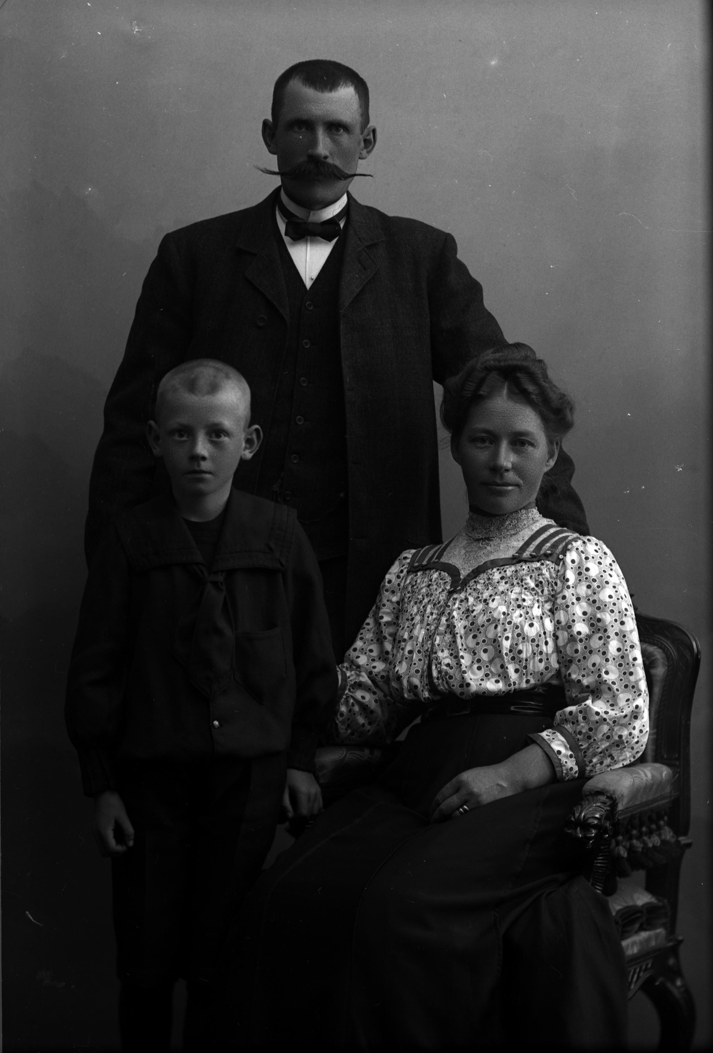 Porträtt i helfigur av mjölnare A. P. Pålsson i Räng, med familj. Frun sittande i stol.
