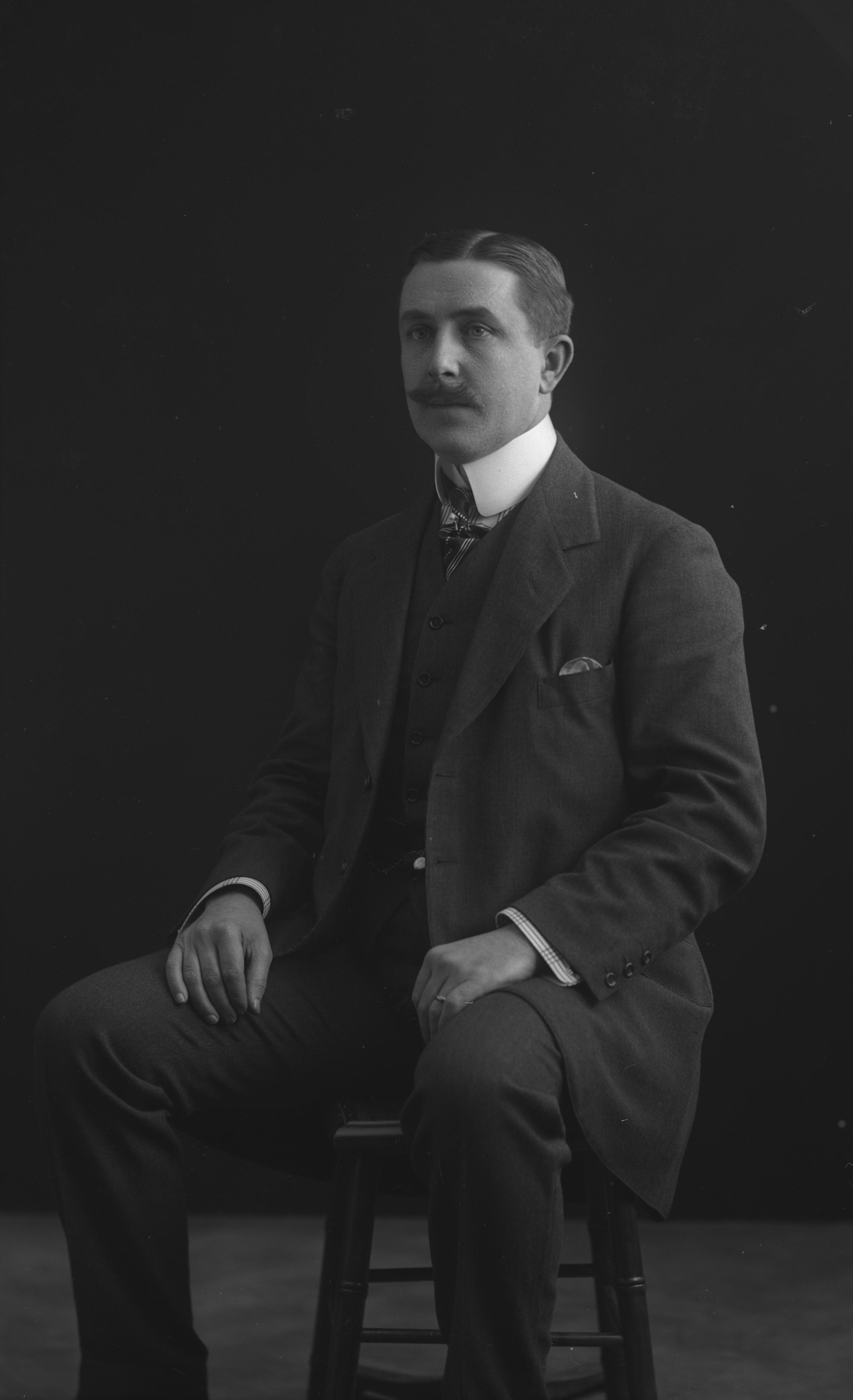 Porträtt i helfigur av grosshandlare Torsten Swedmark, sittande på pall.