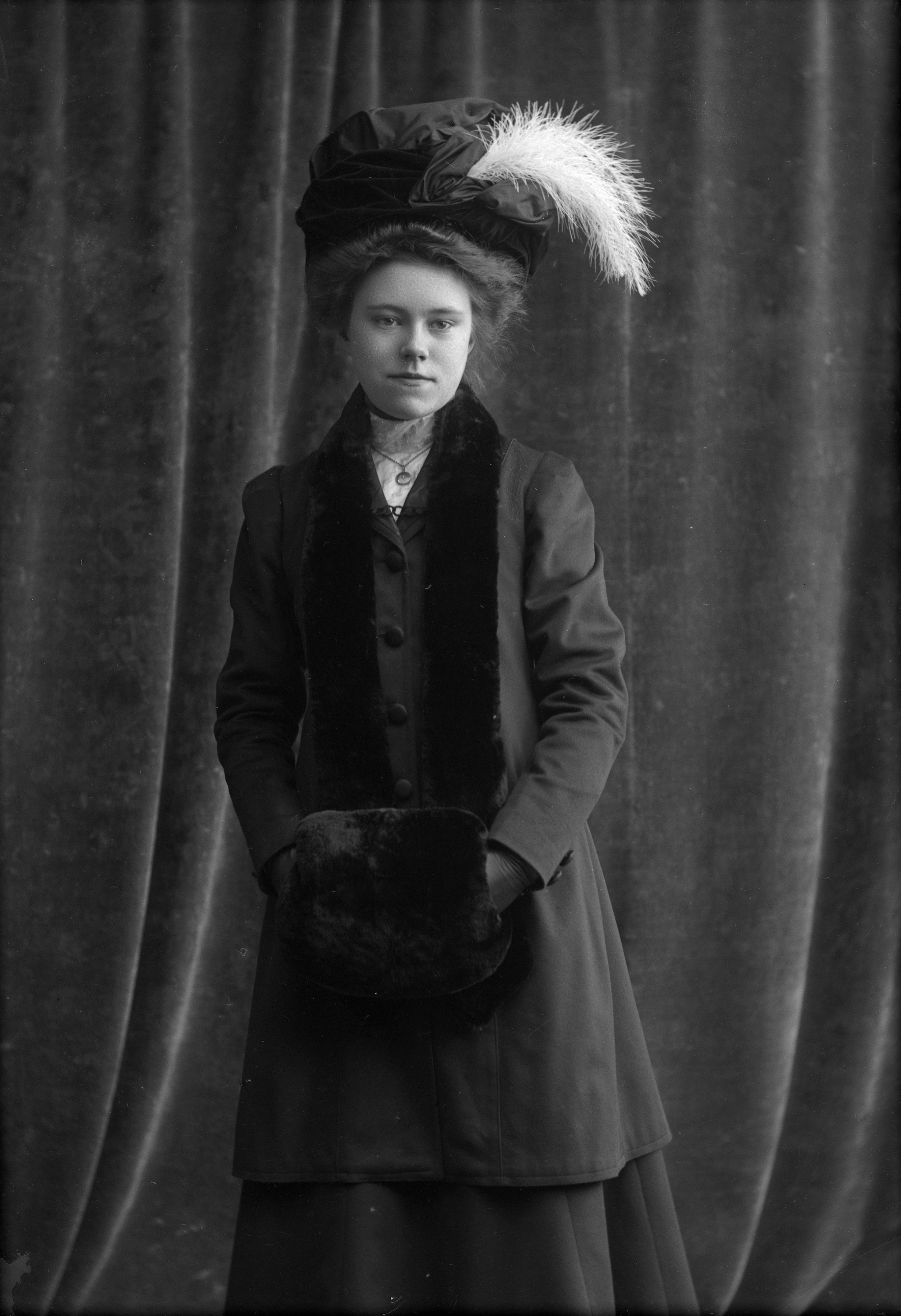 Porträtt i helfigur av Minna Hansson, klädd i ytterkappa och stor hatt med fjäderplym. Hon håller en handmuff i päls.
