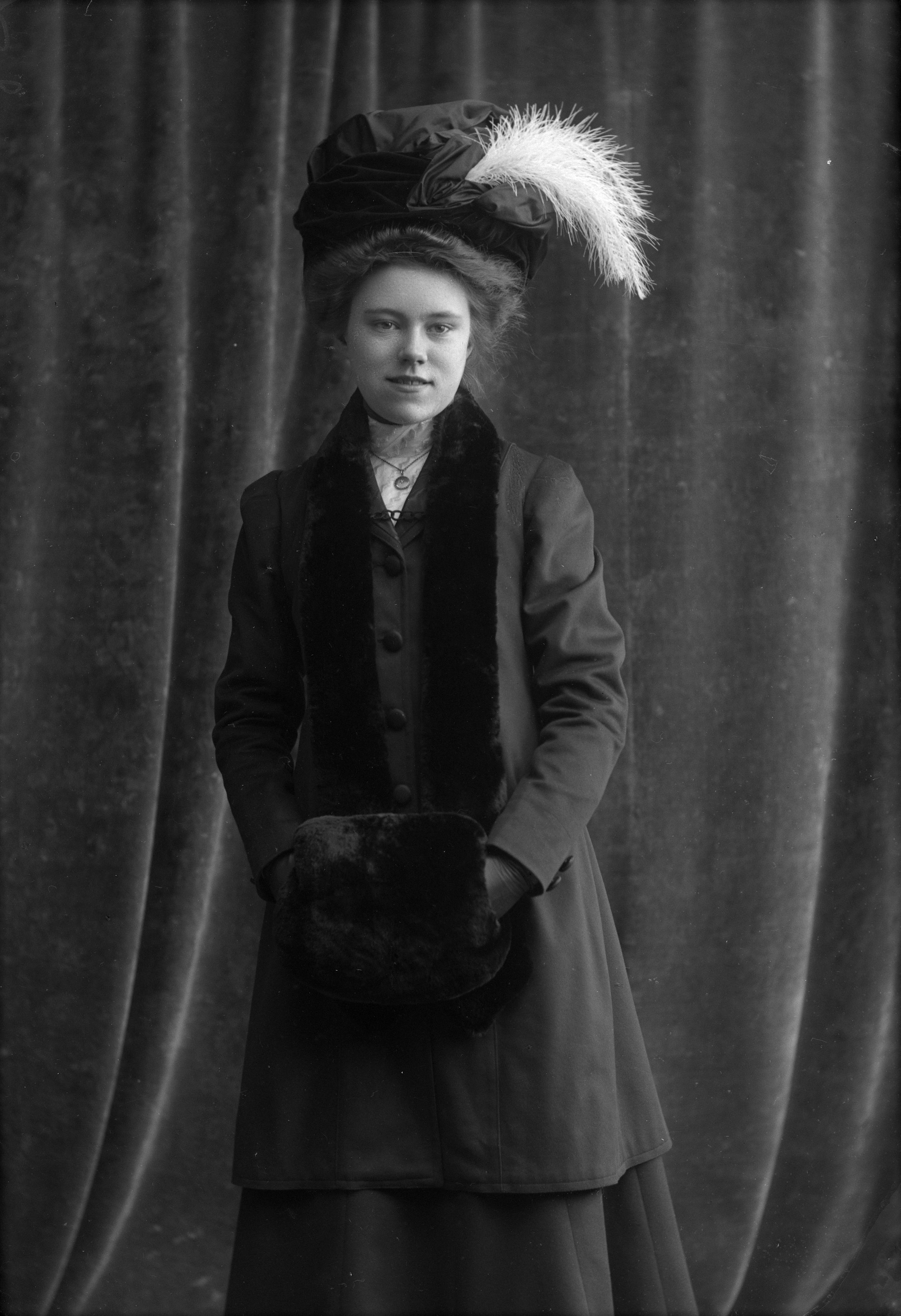 Porträtt i helfigur av Minna Hansson, klädd i ytterkappa och stor hatt med fjäderplym. Hon håller en handmuff i päls.
