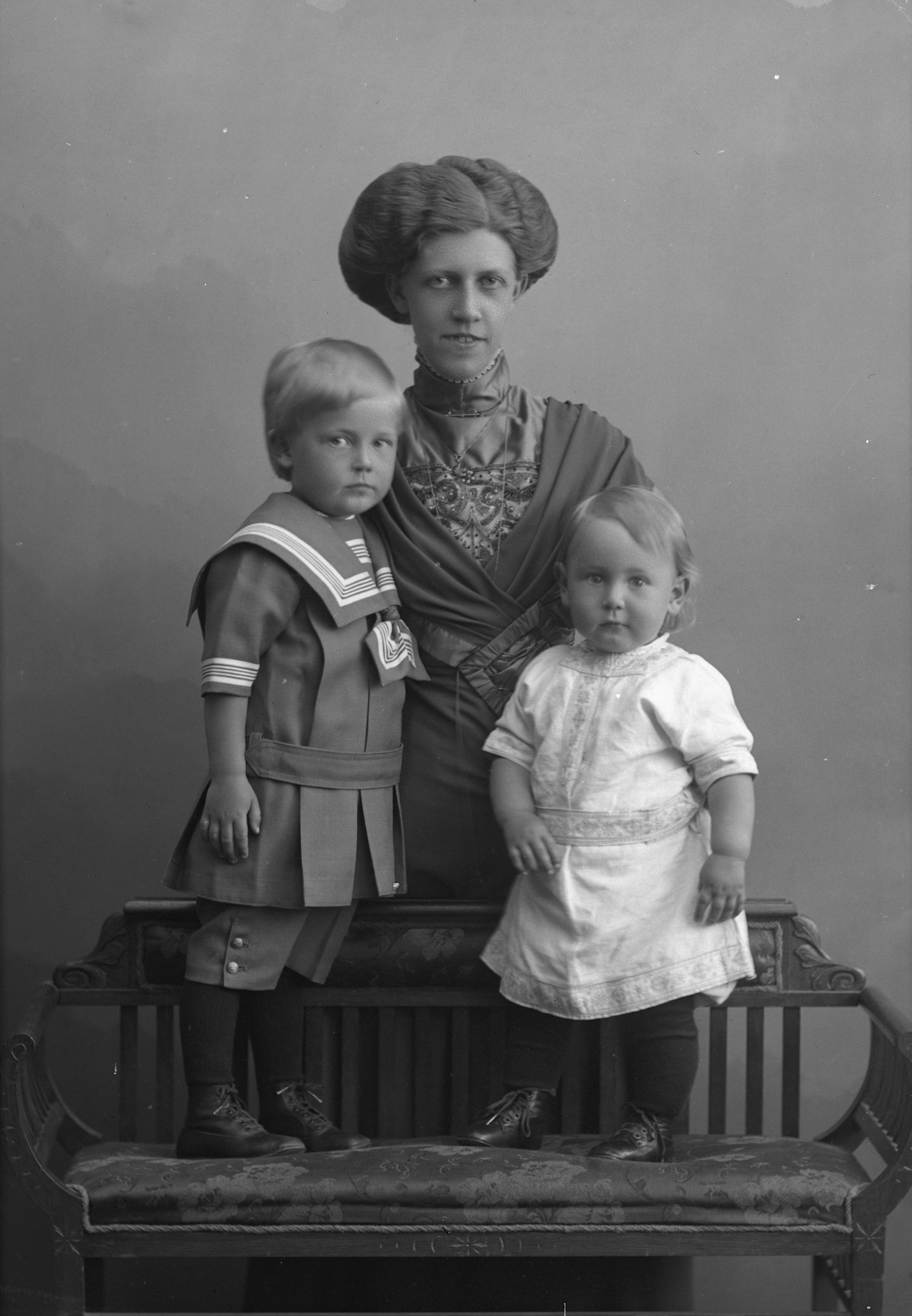 Porträtt i helfigur av Wivika Olofsson med sönerna Valter och Erik. Erik i sjömanskostym.