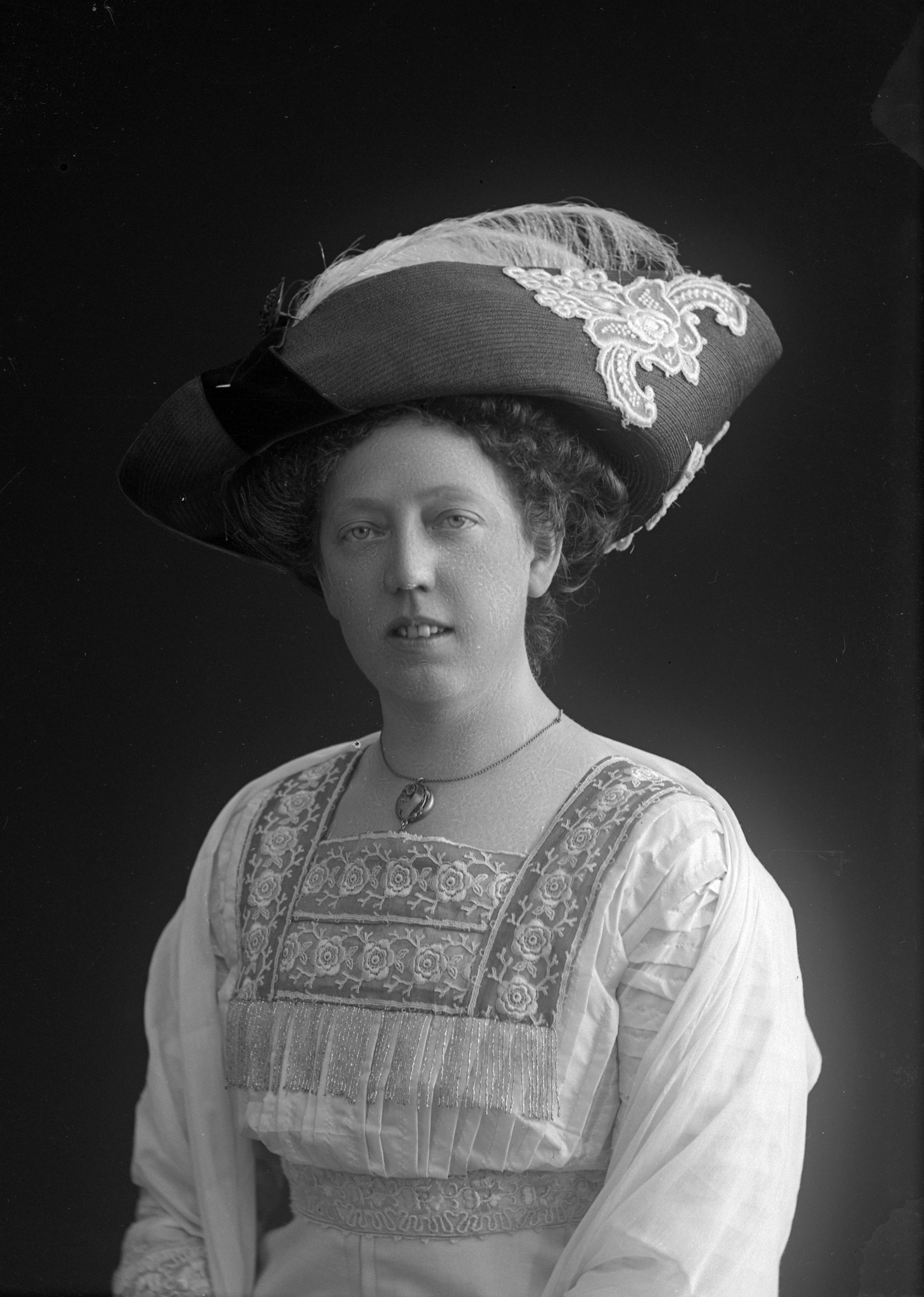 Porträtt i halvfigur av handelsbiträdet Alma Sundberg i stor hatt.
