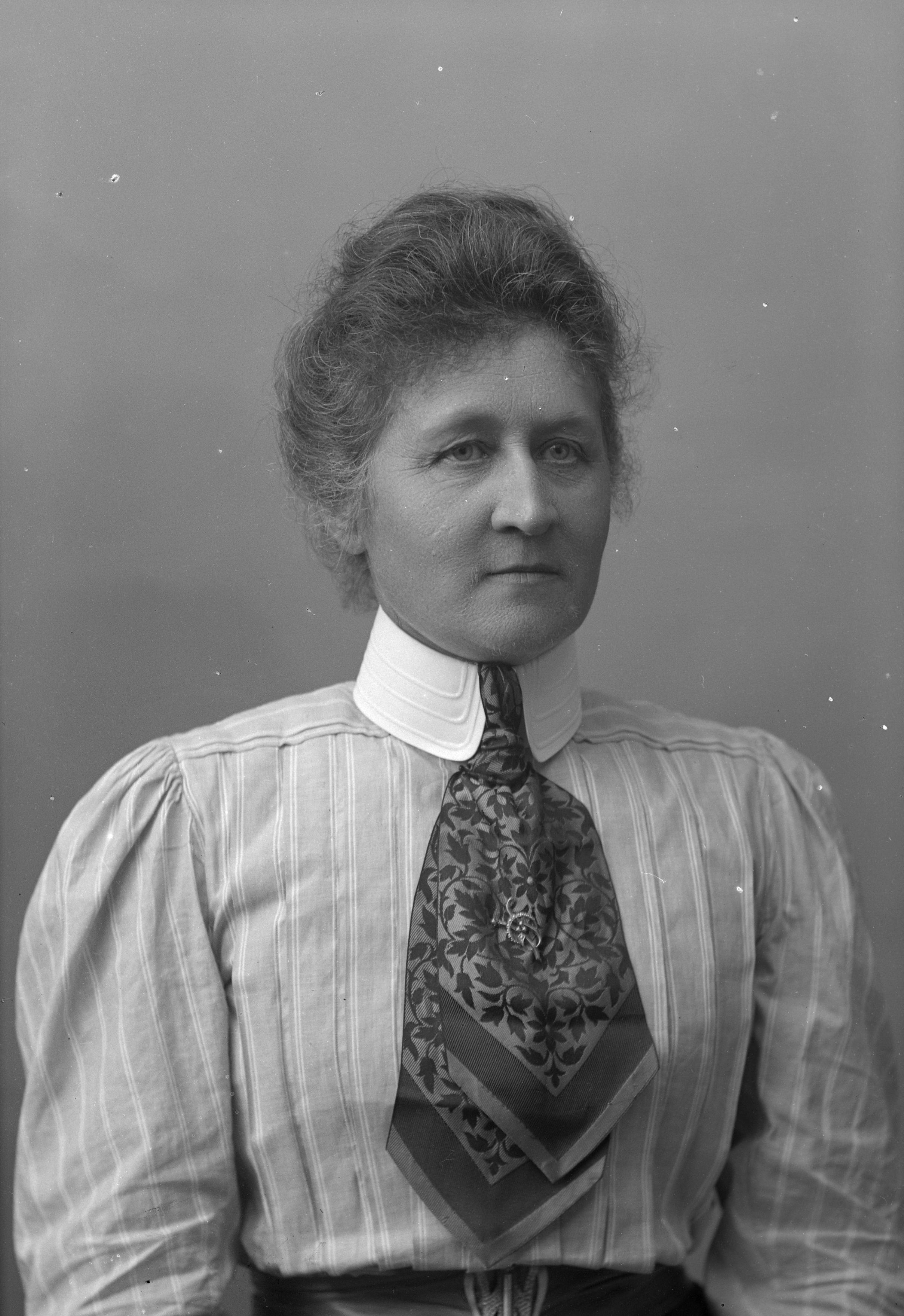 Porträtt i halvfigur av folkskollärarinnan Anna Giese bärande blus med hög krage och scarf.