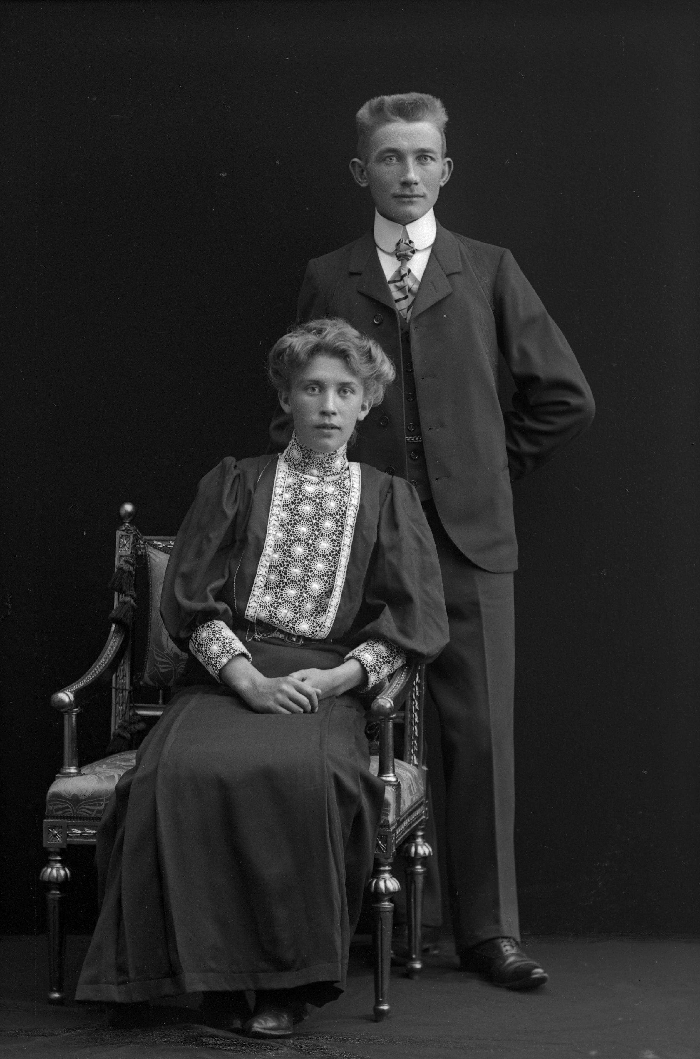 Porträtt i helfigur av L. Mattsson och J. Nordin vid Malmö Snickerifabrik. L. Mattson sittande på stol.