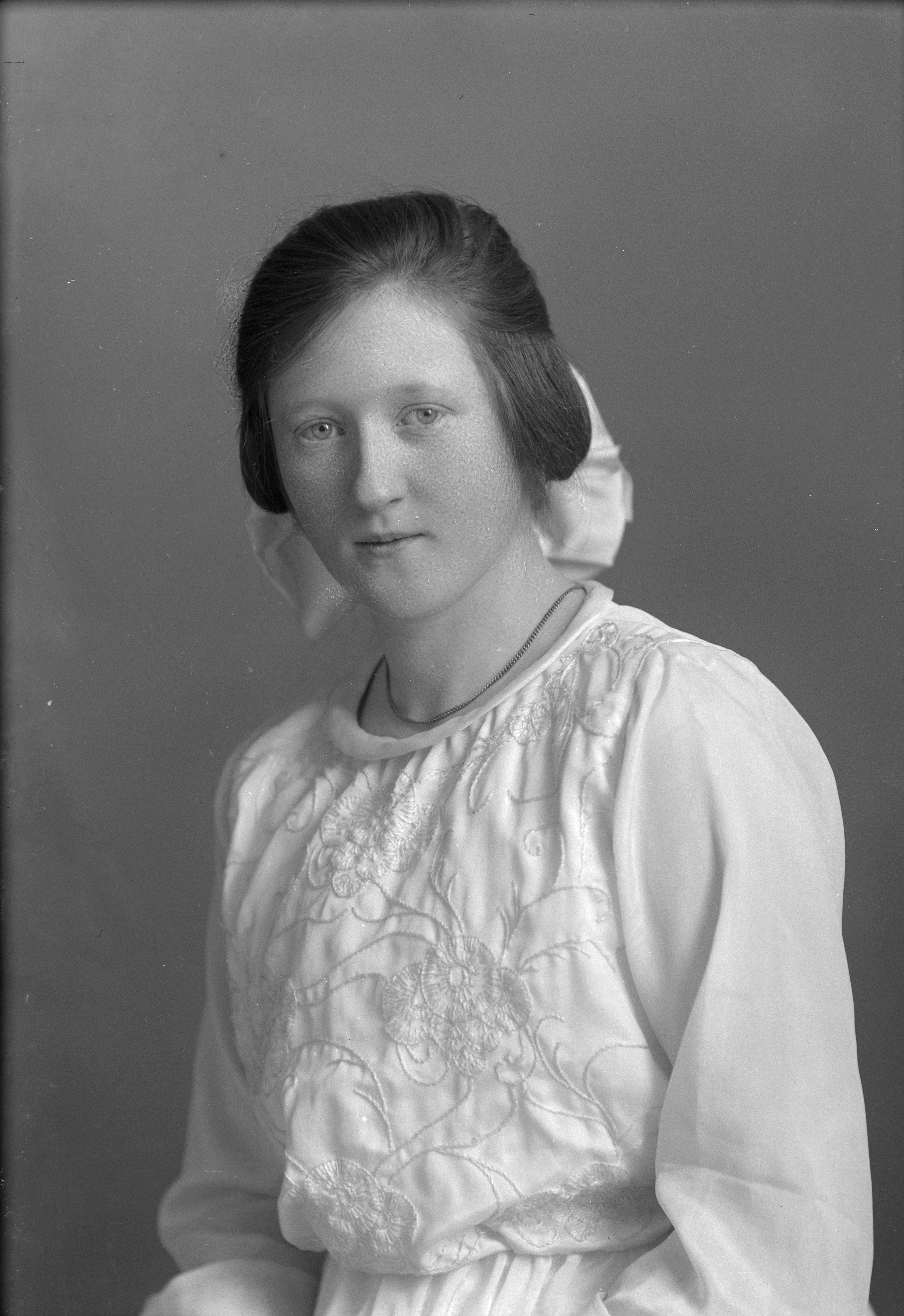 Porträtt i halvfigur av konfirmanden Birgit Wendt med stor rosett i håret.