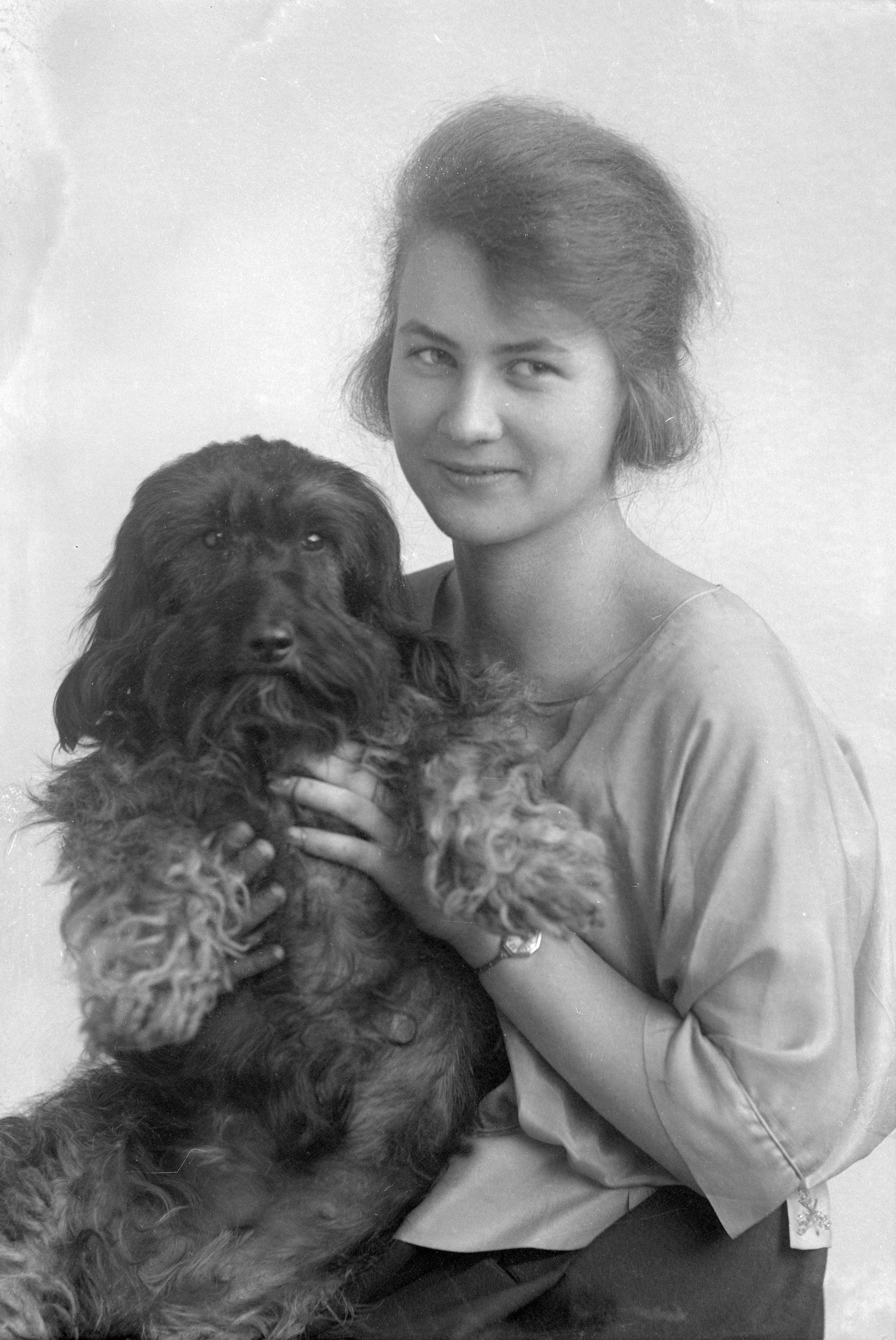 Porträtt i halvfigur av Elsa Appelberg, hållande sin hund i famnen.