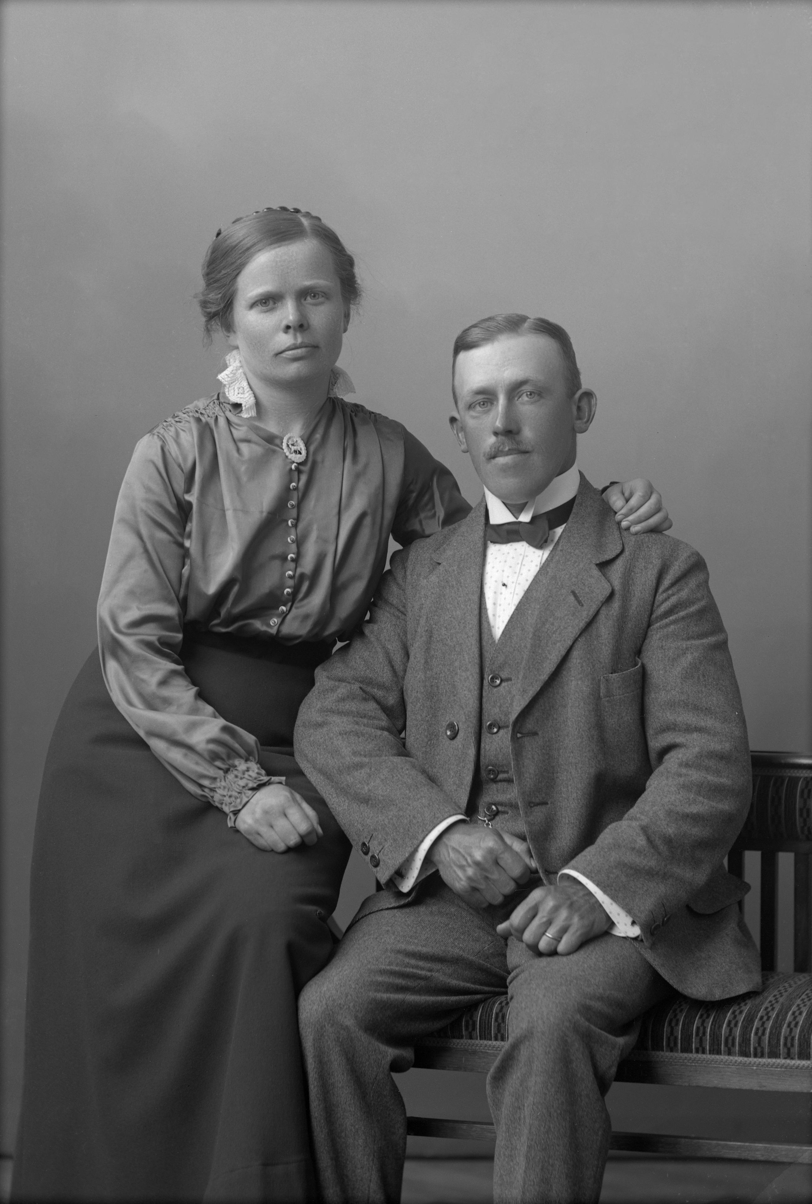 Porträtt i helfigur av lantbrukare Anders Simonsson med fru. Maken sittande i stol.