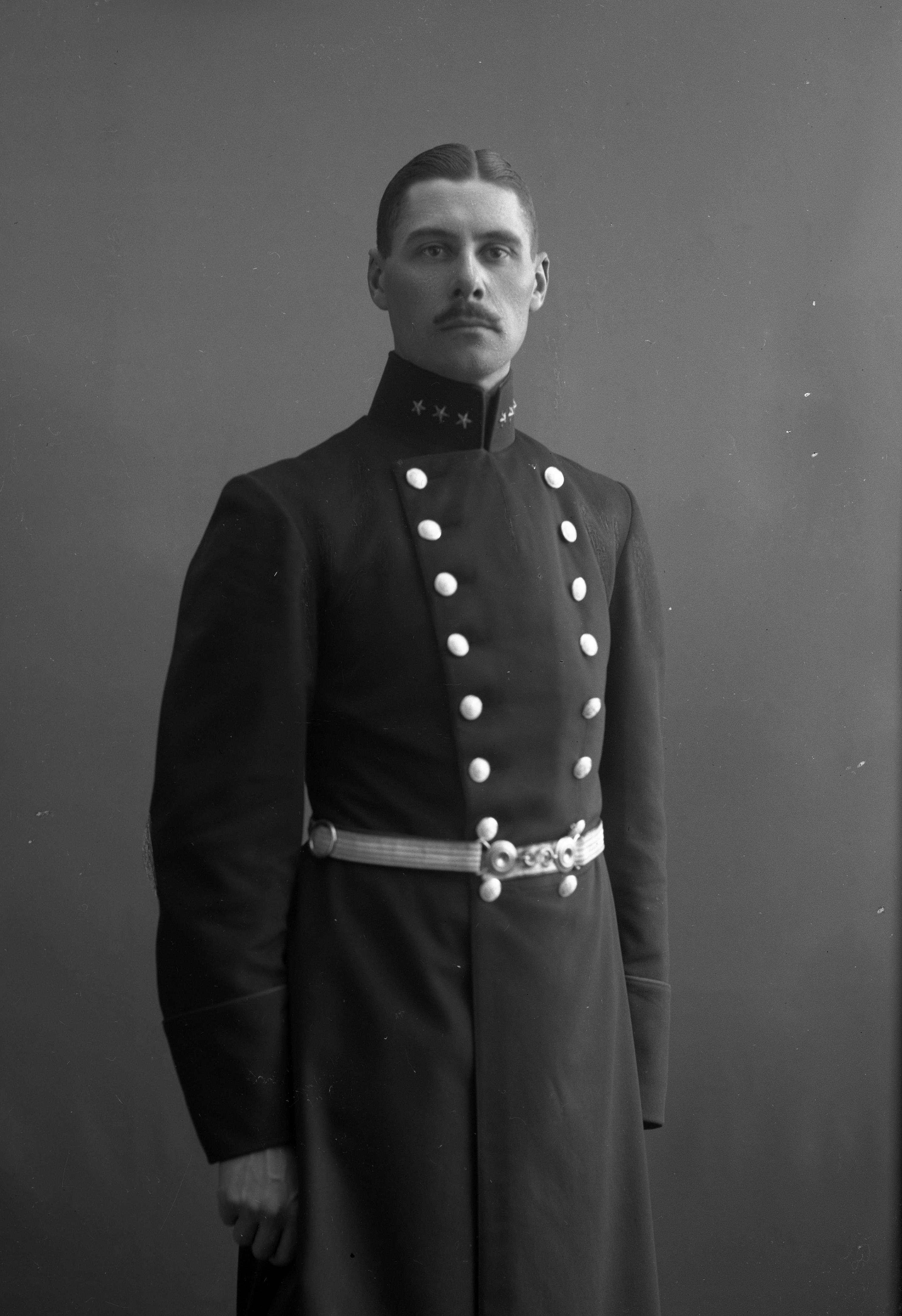 Porträtt i helfigur av regementsintendant Ekberg, iklädd militäruniform.