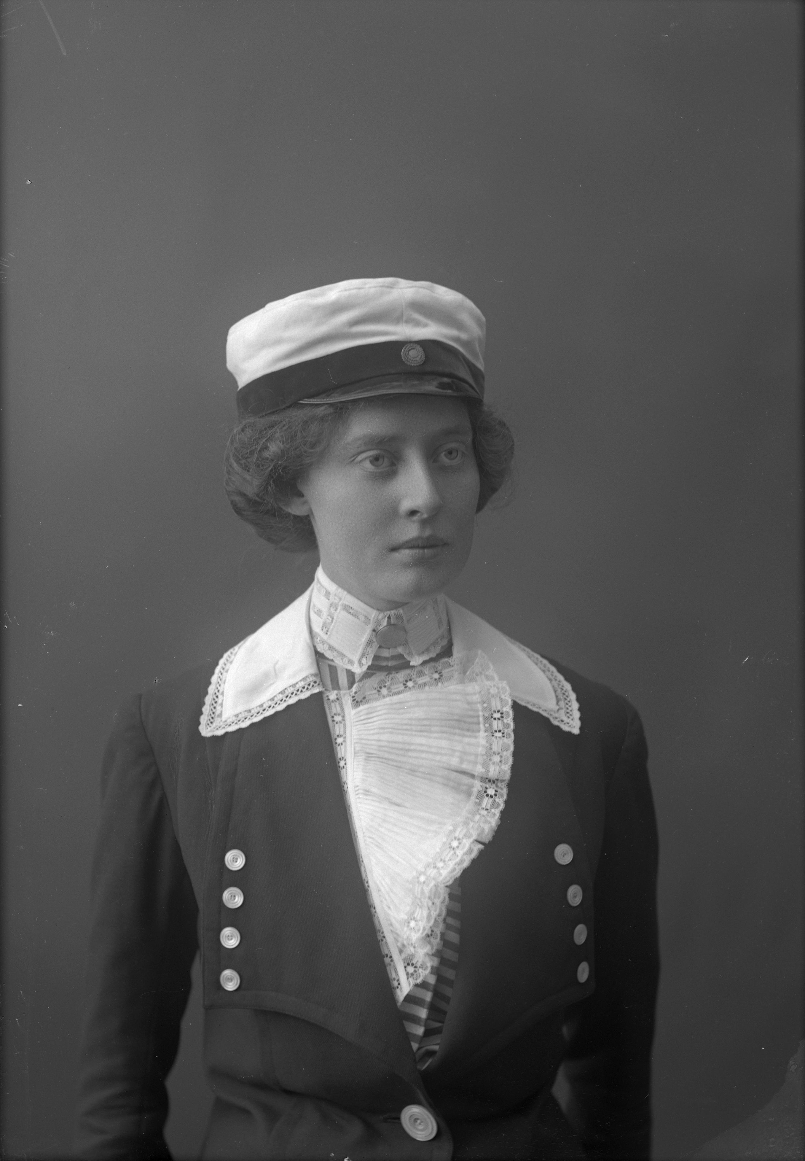 Porträtt i halvfigur av fröken Lindhe, iklädd studentmössa.