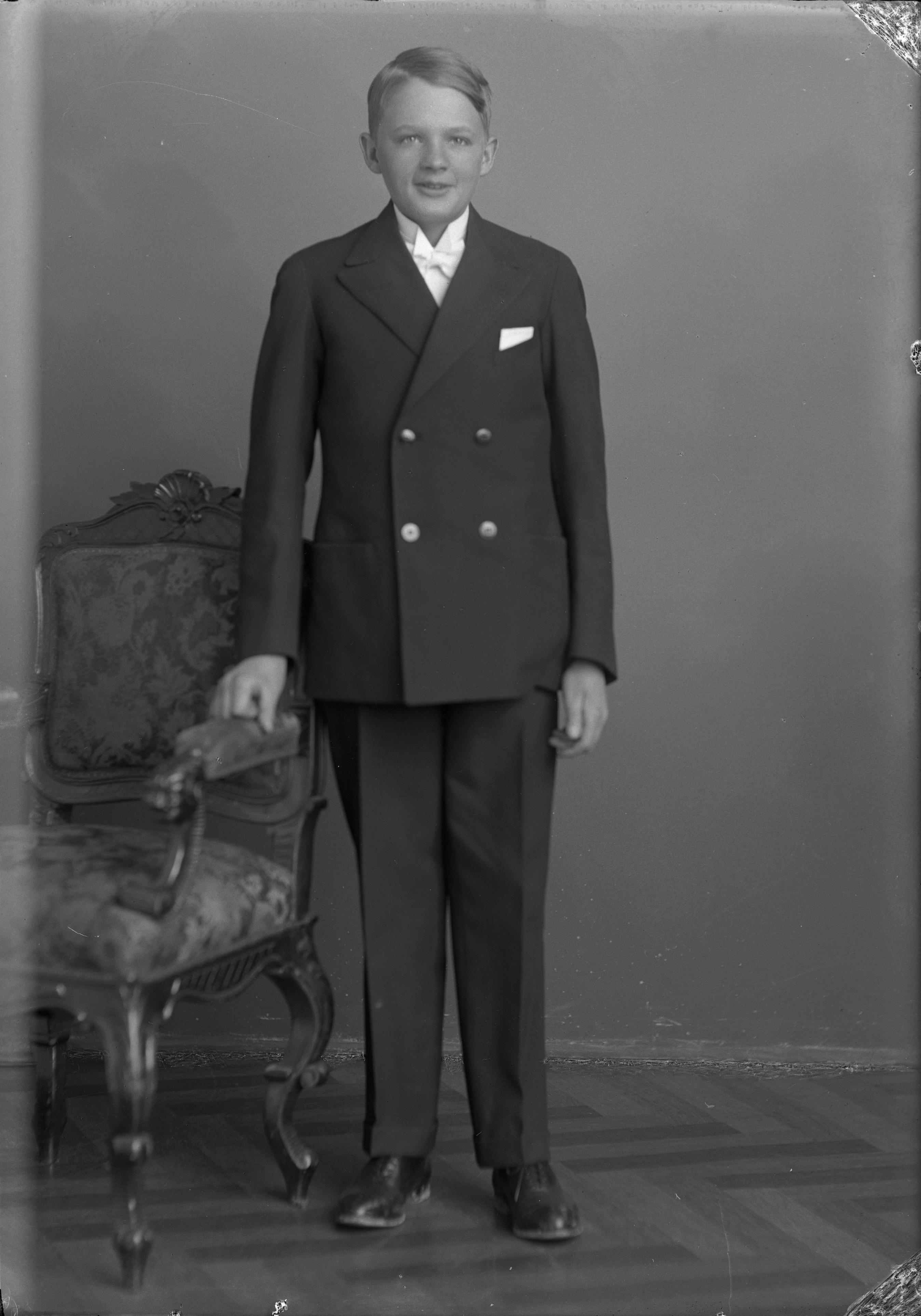Porträtt i halvfigur av konfirmanden Anders Persson, stående vid stol.
