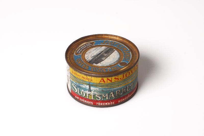 Konservburk i plåt, med texten: "Slottsmärket Ansjovis i ostronsås, A.B. Sveriges Förenade Konservfabriker Göteborg".