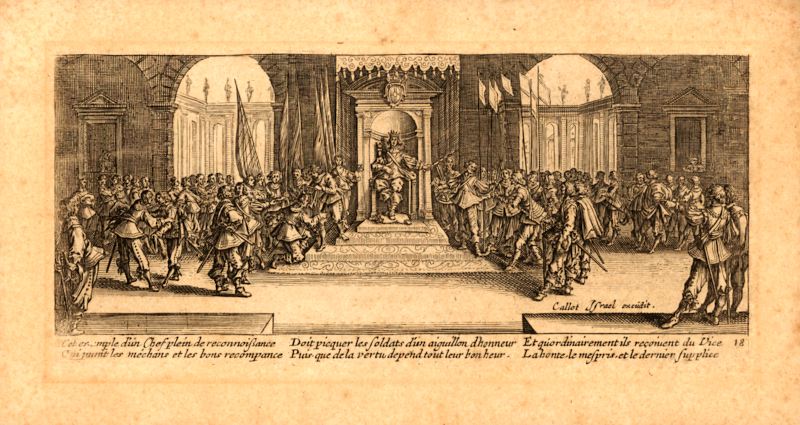"Detta exempel på ärofulla ledare vilka straffar ondskan men belönar godheten, skall soldaterna drivas på med äran, på grund av att deras lycka och välgång baseras på dygden, vilket de annars mottager från synden, vanäran och svåra straff.