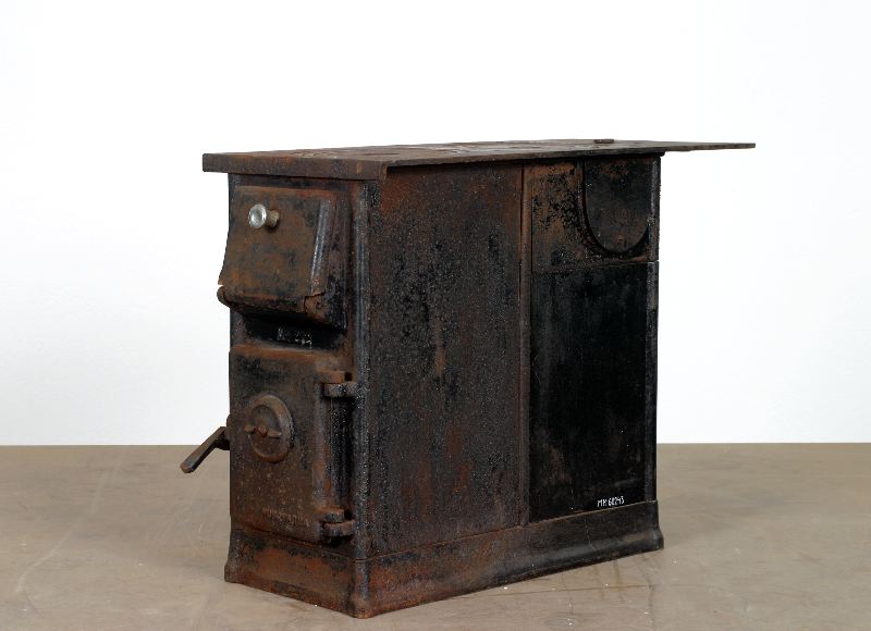 Vedspis, modell mindre, av gjutjärn, rektangulär med två mindre plattor. Två luckor i fronten; den övre för bränsle, den undre med ventil och sotlåda. Märkt: No 212 Husqvarna.