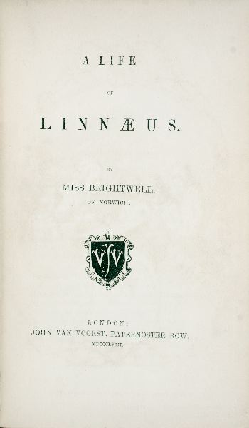 A LIFE OF LINNAEUS BY MISS BRIGHTWELL OF NORWICH. LONDON: JOHN VAN DER VOORST, PATERNOSTER ROW. MDCCCLVIII