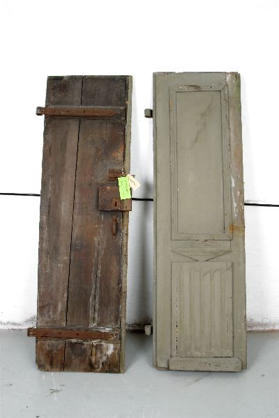 Dörrar med två speglar, den undre med lodräta räflor. mellan speglarna ett rombiskt fält. Kammarlås och nyckelskylt. Rigel upp- och nedtill. Kraftiga bandgångjärn.