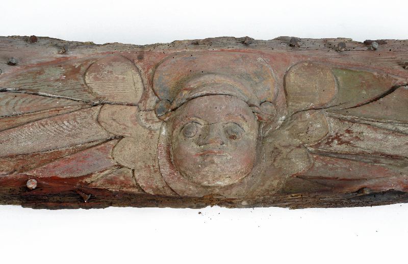 - Löshult av fur, dekorerat med ett snidat kerubhuvud med huvudbonad;mössa/hatt . Bemålat i rött . Från 1600-talets tidiga hälft. Ytan är täckt med sekundära järnspikar; från tidigare överputsning.