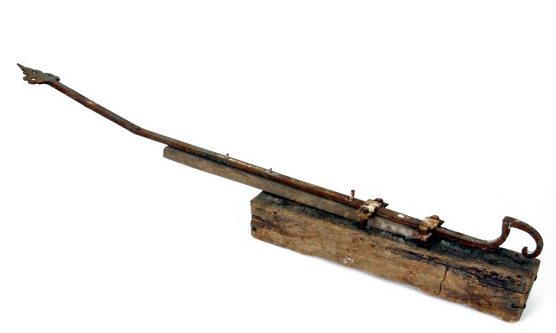 Bandgångjärn till dörr/port. Dekor i båda ändar, försett med ett antal skruvhål. Fastsatt i trästycke med sekundära bultar.